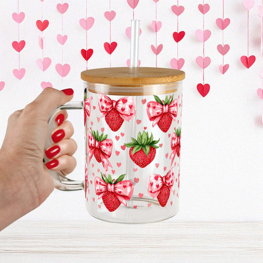 Valentine's Day Strawberry Bows 17oz Glass Mug With Lid and Straw