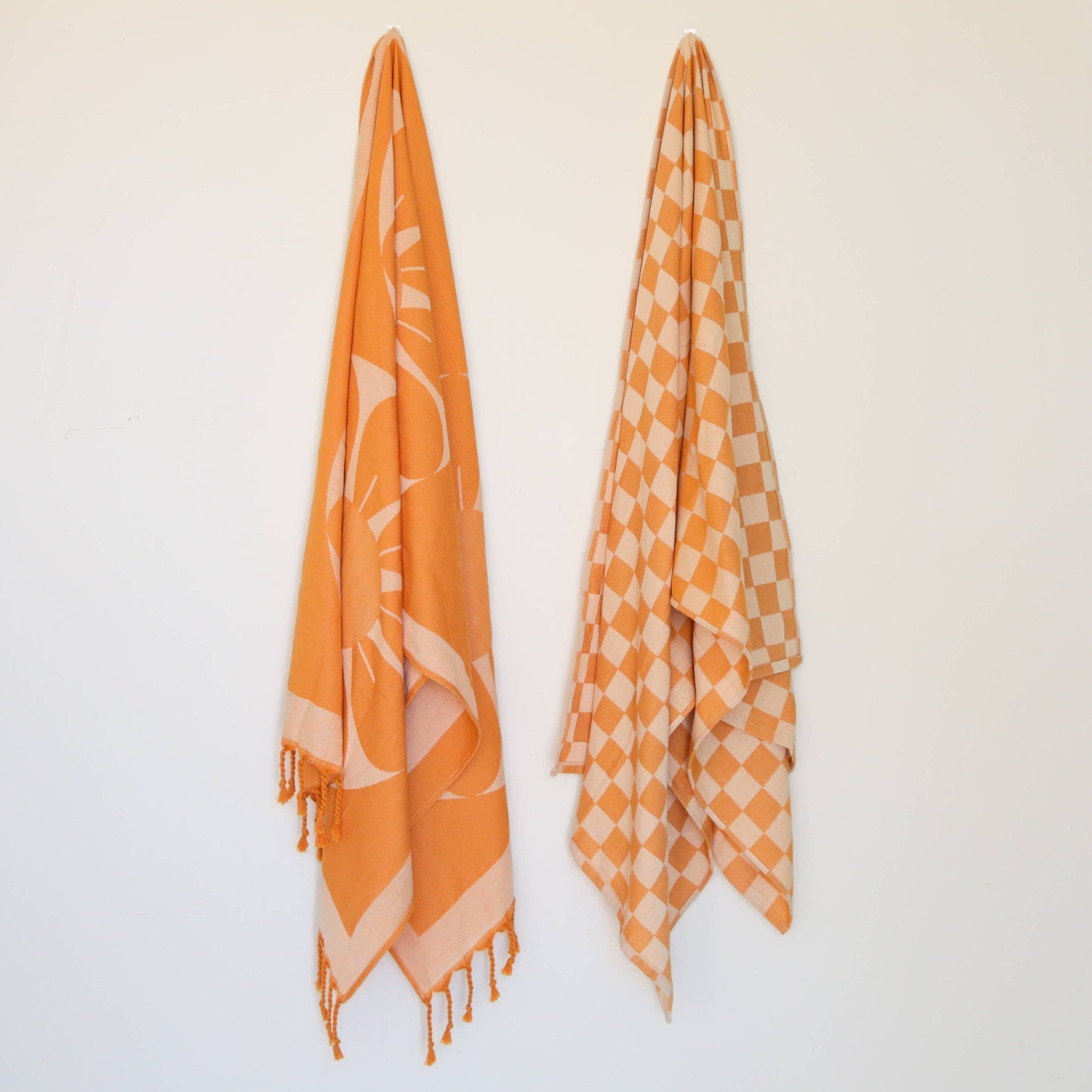 100% Turkish Cotton Sand Resistant Beach Towel in Orange/Tan Checker | Groovy '70s Aesthetic Themed Checkered Large Thin Towel