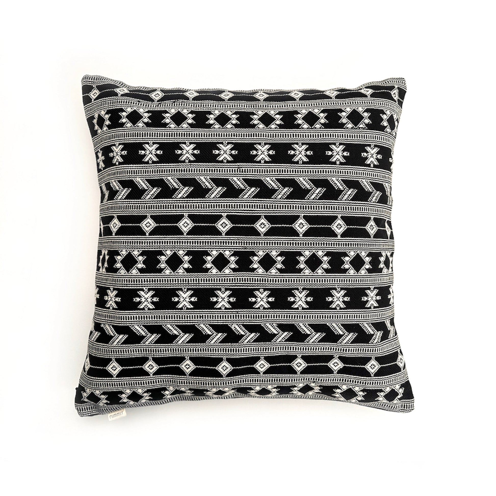 Maker: Nimmit 100% Organic Cotton handloomed, handwoven front with plain back pillow cover and a bottom invisible zipper.  Nimmit started with two handloom weavers in 1975 and in the beginning of 2020 and now work with approx 61 looms engaged in Kala cotton and Mashru weaving. Tribal textiles are woven on a loin-loom, a type of back-strap loom commonly used by hill people. The warp of manageable length and breadth is prepared and fastened at one end generally to the wall of a house or to two fixed poles while the other is tied to the waist of the weaver with a cotton or leather belt. Sometimes the belt is woven out of cane or bamboo. 20 x 20" Weight: 0. 55 lbs