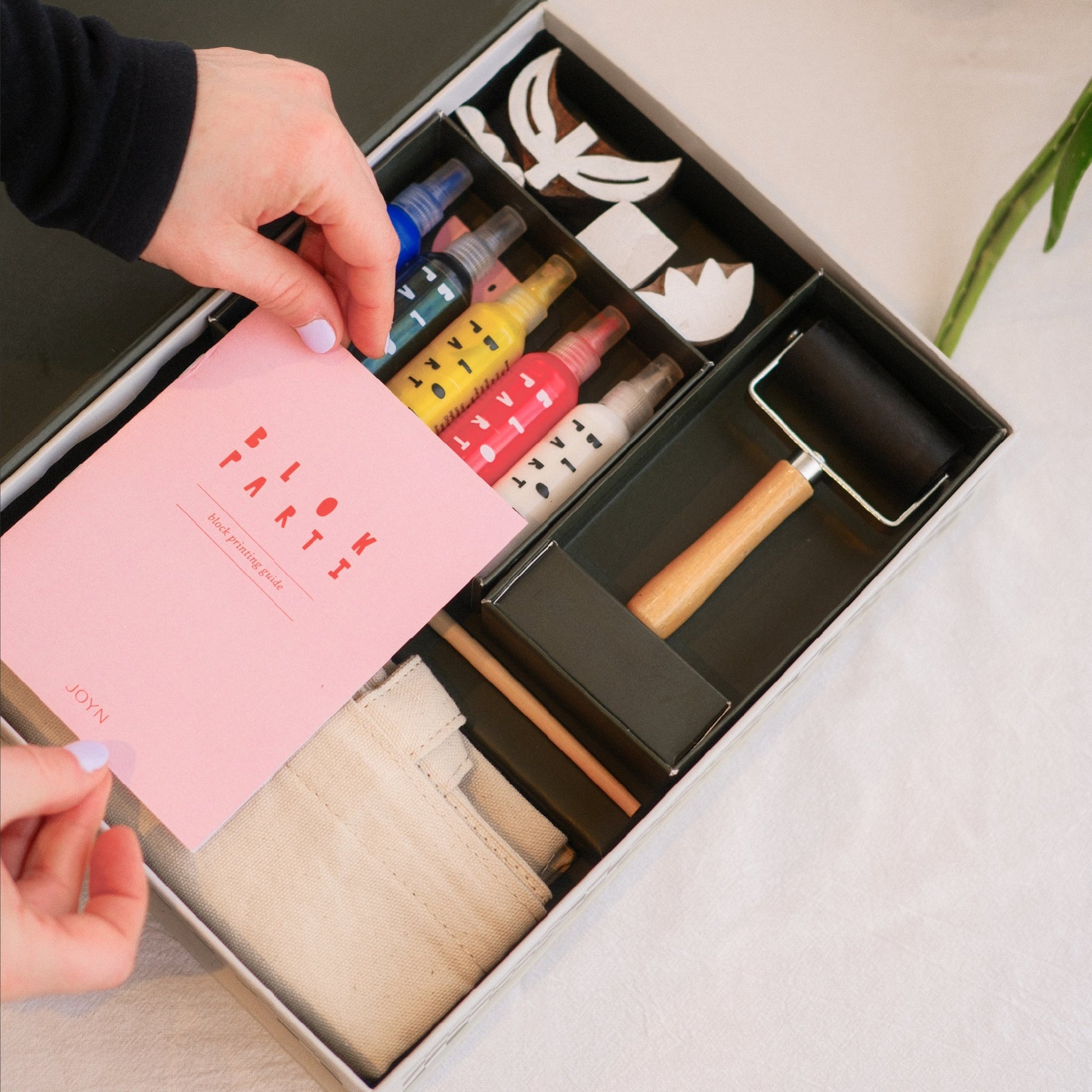 Everything you need to create your own block printed tote bag. Inside this block printing kit, you’ll find all the tools you need to learn the art of block printing, including hand-carved wooden blocks, five block printing inks, and a handcrafted tote bag. No experience necessary - simply follow the easy steps in the guide and take a moment to slow down, get creative and enjoy the process. What’s Included: - Four hand carved wooden blocks (Indian Blackberry Wood). - Blocks include; Tulip flower, Tulip plant, Square, Half circles border - One handcrafted cotton tote bag designed for everyday use (13.5 x 15.5”, handle drop length - 10”). - Five bottles of non-toxic, acrylic block printing inks in black, white, red, blue, and yellow (0.84 fl oz / 25ml). - One rubber brayer for smooth application. - One paintbrush with natural uncoated wooden handle. - One acrylic ink plate. - One block printing guide filled with tips and ideas.