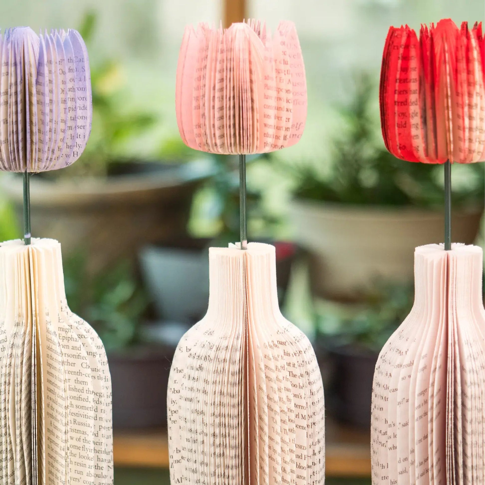 Our book flower vases are sold individually and are created from the pages of cast off literature. Our unique flower vases make wonderful Christmas gifts, paper anniversary gifts, housewarming gifts, and are loved for mother's day and Valentine's Day. It looks stunning as a centerpiece on your dining room table or as a standout on your bookshelf. Use as a centerpiece at your next special occasion--baby shower, wedding, birthday party. This paper vase flower is perfect for that special someone in your life who literally already has everything----except this! And the great thing is...you don't have to water it! The vase and flower will stay looking amazing for years to come! Dimensions: 12"H x 3"W