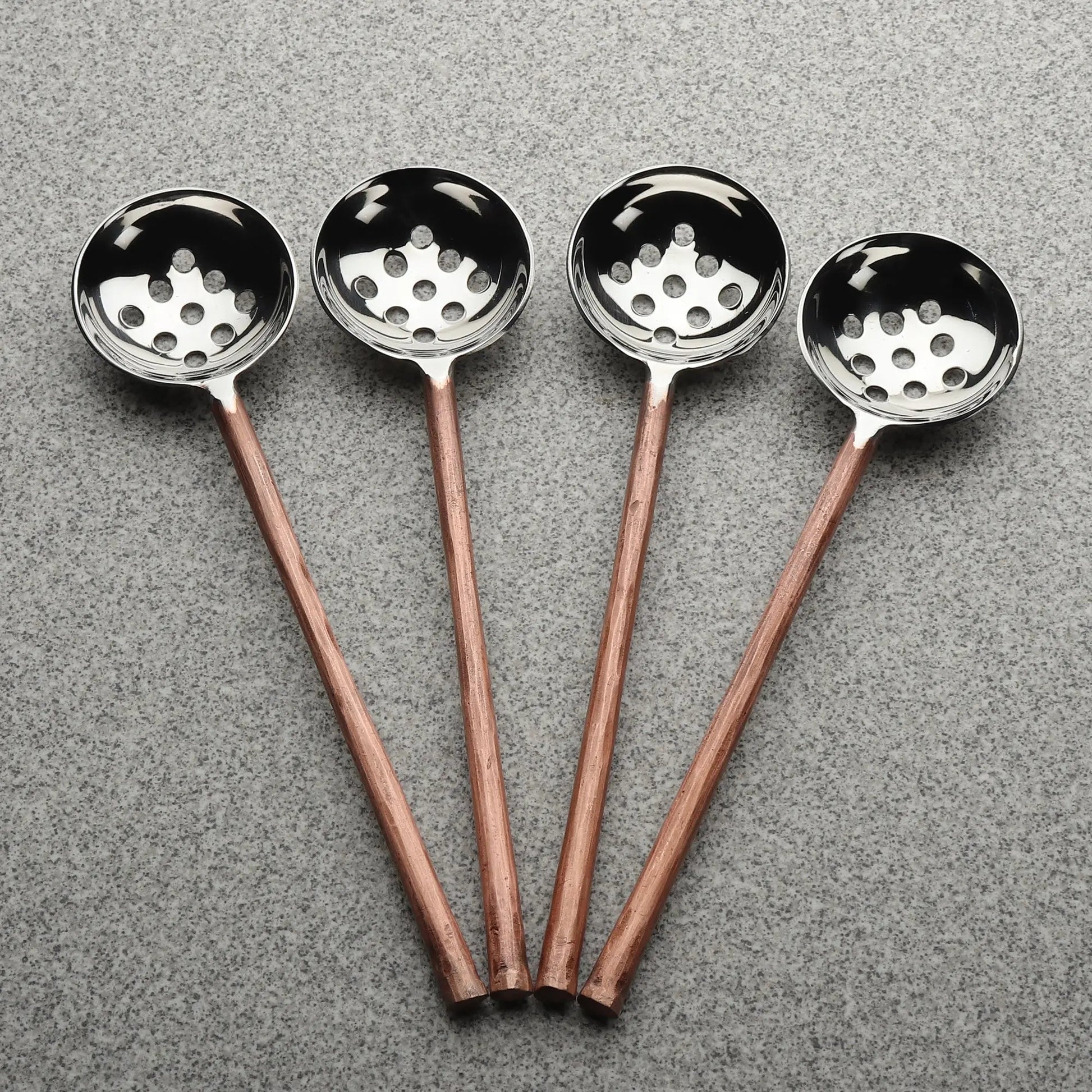 Our Camellia Antique Copper Olive Spoons 4 Pc. Set is perfect for the home bar and will be a handy accessory for your cheese and pickle platters. Rustic textured handles in an antique copper finish offset the polished silver spoons. Designed to scoop olives or cherries from the jar, each spoon has several perforations for straining brine and syrup.