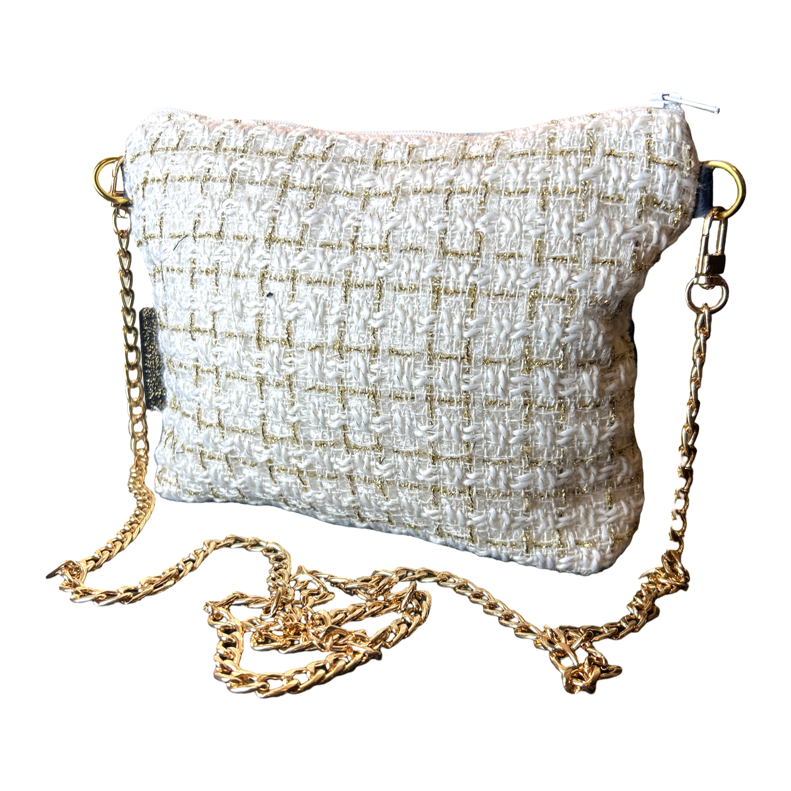 Vintage Chanel 100% silk scarf front paired with coordinating tweed reverse. Fully lined with zippered closure with removable 23" drop gold-tone crossbody chain.
