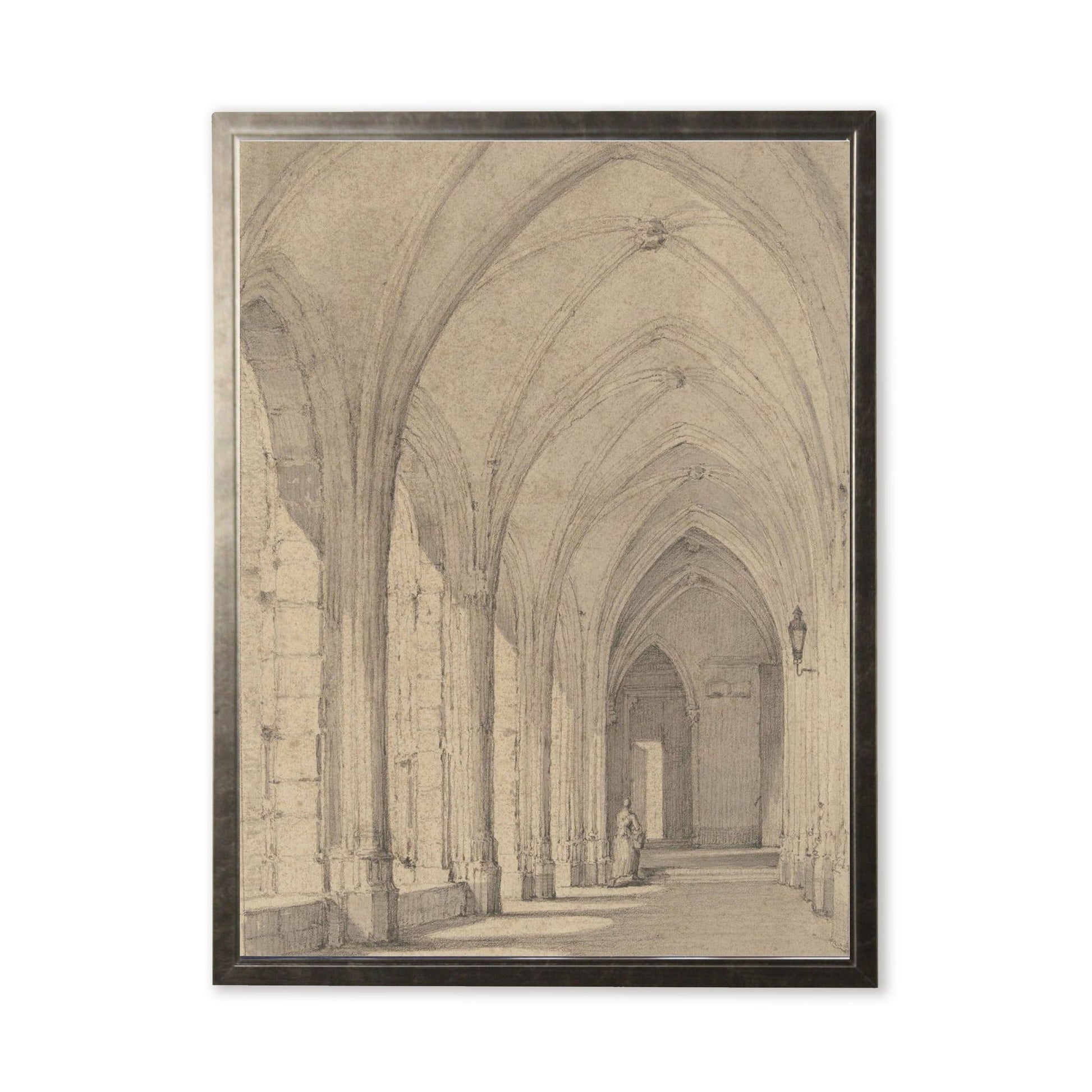 This vintage-inspired print, framed in a silver wooden frame, features a painted church hallway. Sized at 18 inches by 24 inches, this made in the USA frame makes for a beautiful addition to any wall.