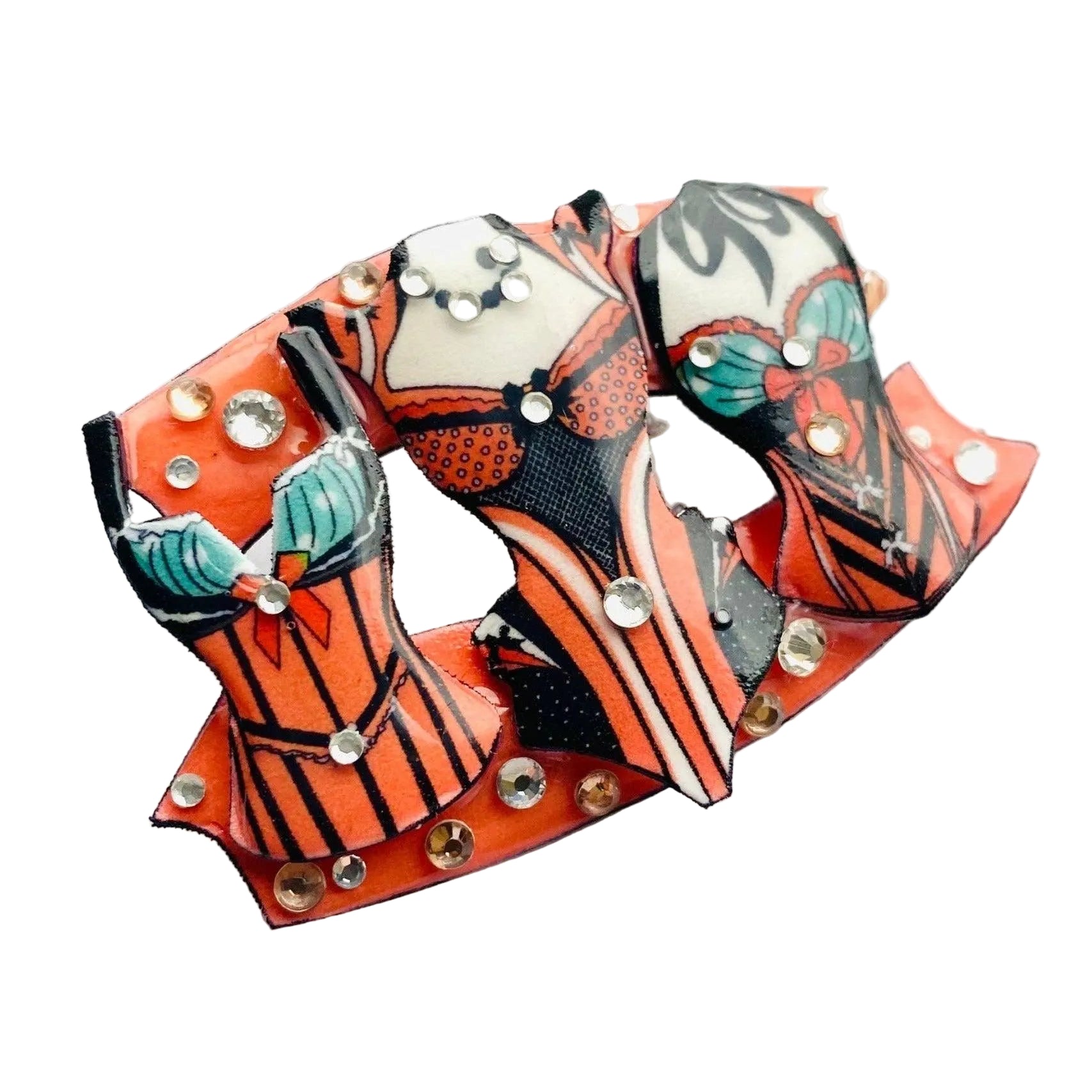 Celebrate vintage glamour with this handcrafted Corset Brooch by Rosie Rose Parker, inspired by 1950s burlesque performance wear. Featuring three intricately detailed corsets adorned with precisely placed gems, this statement piece captures the allure and artistry of a bygone era. Illustrated by artist Michelle Finnerty and signed on the back, each brooch is individually handmade in our Southsea studio using traditional jewelry-making techniques. Perfect for adding nostalgic flair to any outfit. Hand wash only—keep away from washing machines to preserve its beauty and craftsmanship.