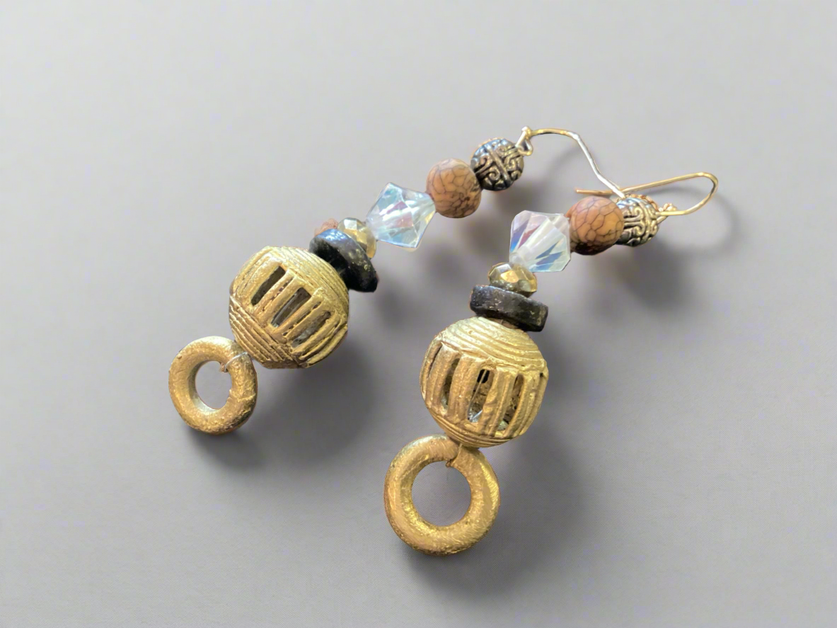 Handcrafted earrings with lost wax cast brass, recycled glass and other sparkles!