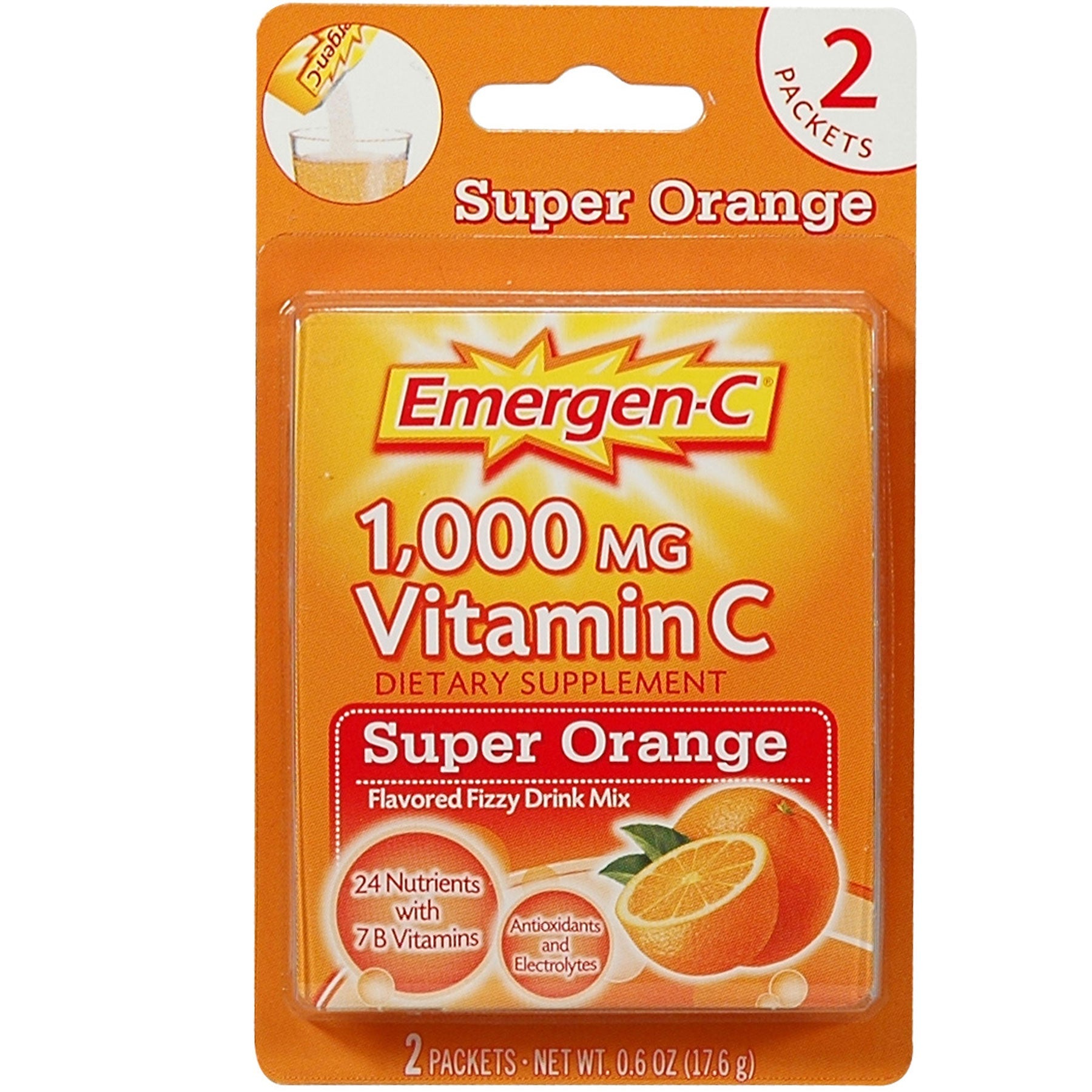 Why settle for a good day when you can have a super one? Emergen-C Vitamin C drink mix is a great way to help support your immune system with Vitamin C as part of your daily wellness routine. Emergen-C dietary supplement provides 1 000 mg of Vitamin C more than 10 oranges (1) and is packed with B Vitamins and other antioxidants (2) for immune system support plus electrolytes to help replace any that are lost during your daily workout*. Emergen-C vitamin drink mixes are made with natural real fruit flavors plus they have no artificial sweeteners and are caffeine free. Just add to 4 to 6 ounces of water for a fizzy citrus-y boost of goodness. With more than 20 tasty flavors plus a variety of special formulas Emergen-C dietary supplements make it deliciously easy to support your wellness goals. Transform your day every day with Emergen-C.