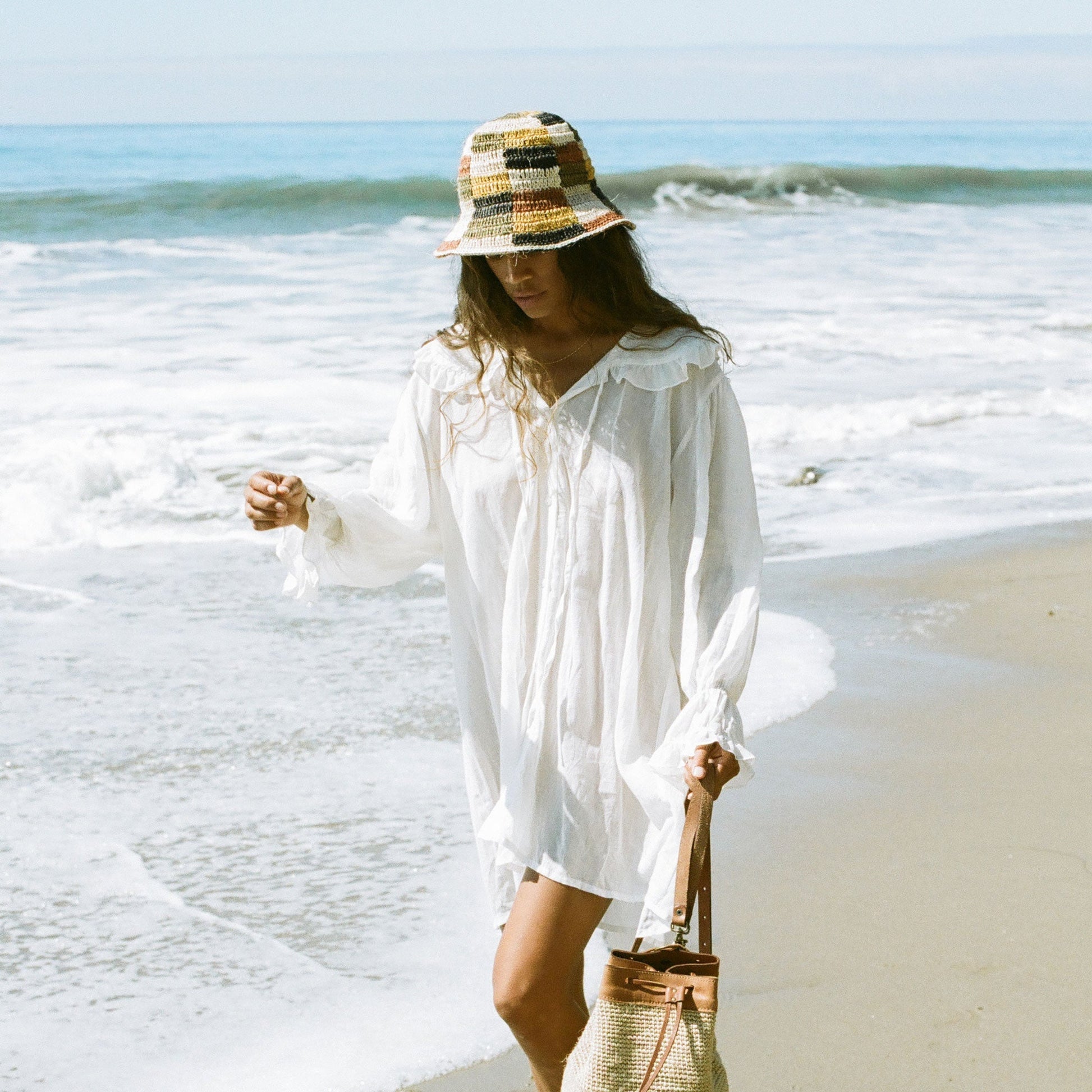 This crocheted, plant-dyed checkered bucket hat is an exclusive design for this Fall. Made by hand from naturally-dyed, cabuya plant fiber. A cute, packable hat made by hand and in small batches by our talented women artisan group. In Stock & Shipping Now. Our hats are handmade and one-of-a-kind. This means that no two are exactly alike and almost all contain irregularities from size to color. Please allow for slight imperfections as this is what adds to the unique character of each hat. Style Notes Plant Dyed & Crocheted Natural Fiber Moveable 3-4" brim Flexible elastic inner band for the best fit 100% crafted by hand Sizing Guide Our bucket hats include a flexible elastic inner band so most hats fit all heads, yet since they are handmade it's better to choose the size range. S 53-55cm M 56-58cm L 59-61cm