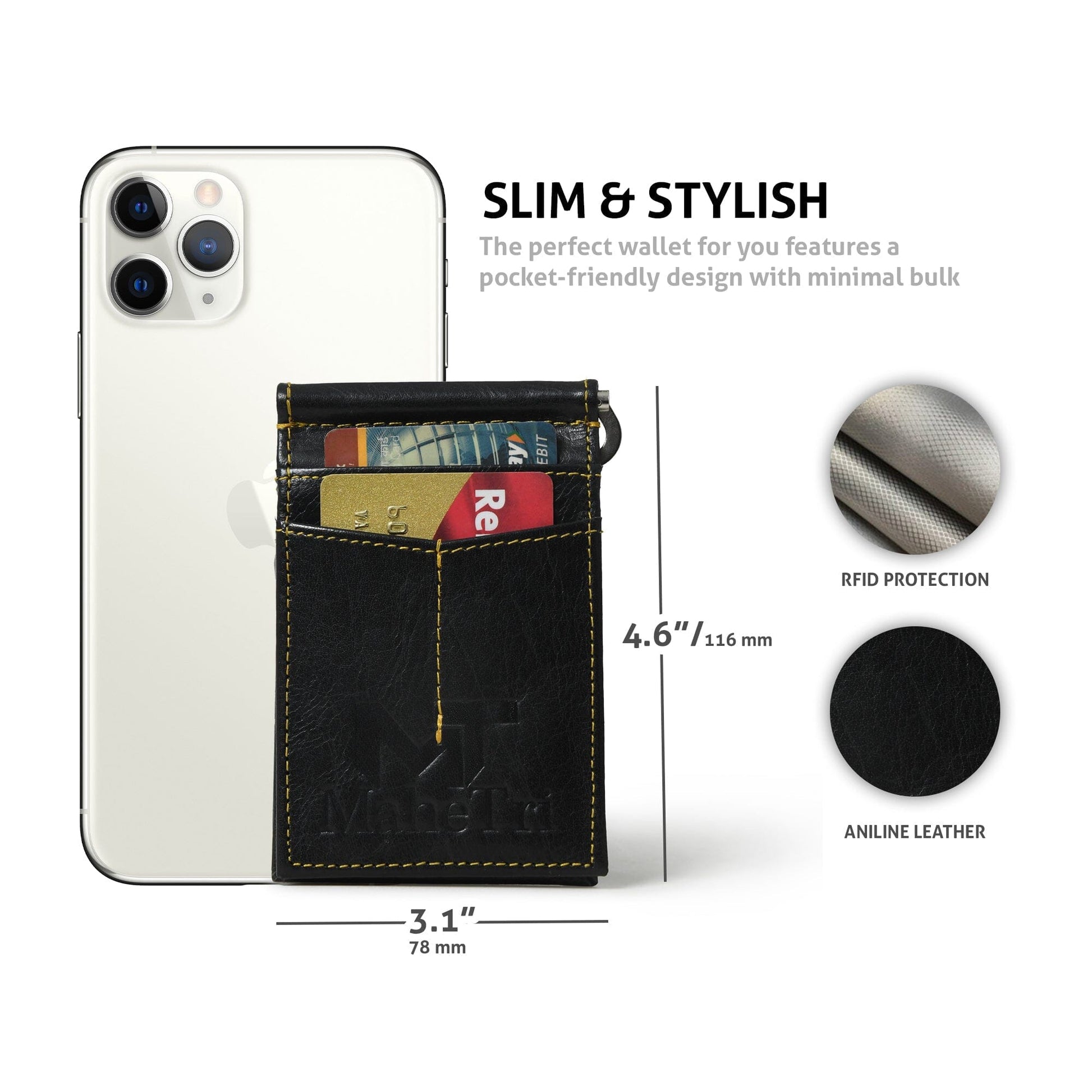 A beautifully crafted very slim profile money clipper wallet for men. It is handcrafted from buffalo leather by highly skilled artisans. This money clipper wallet features a few card slots, an ID slot, and an interior money clip that keeps the cash organized and safe.