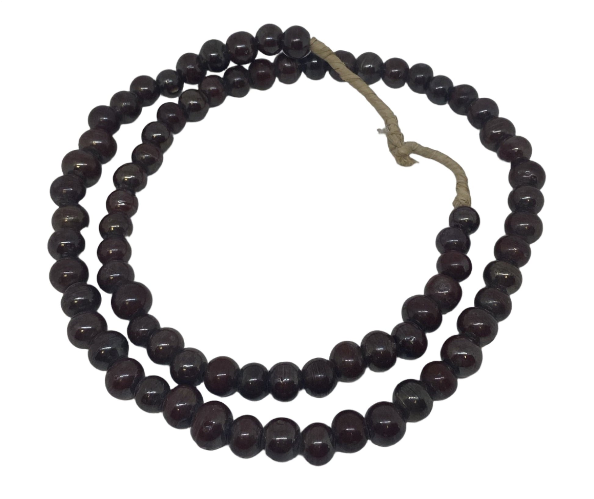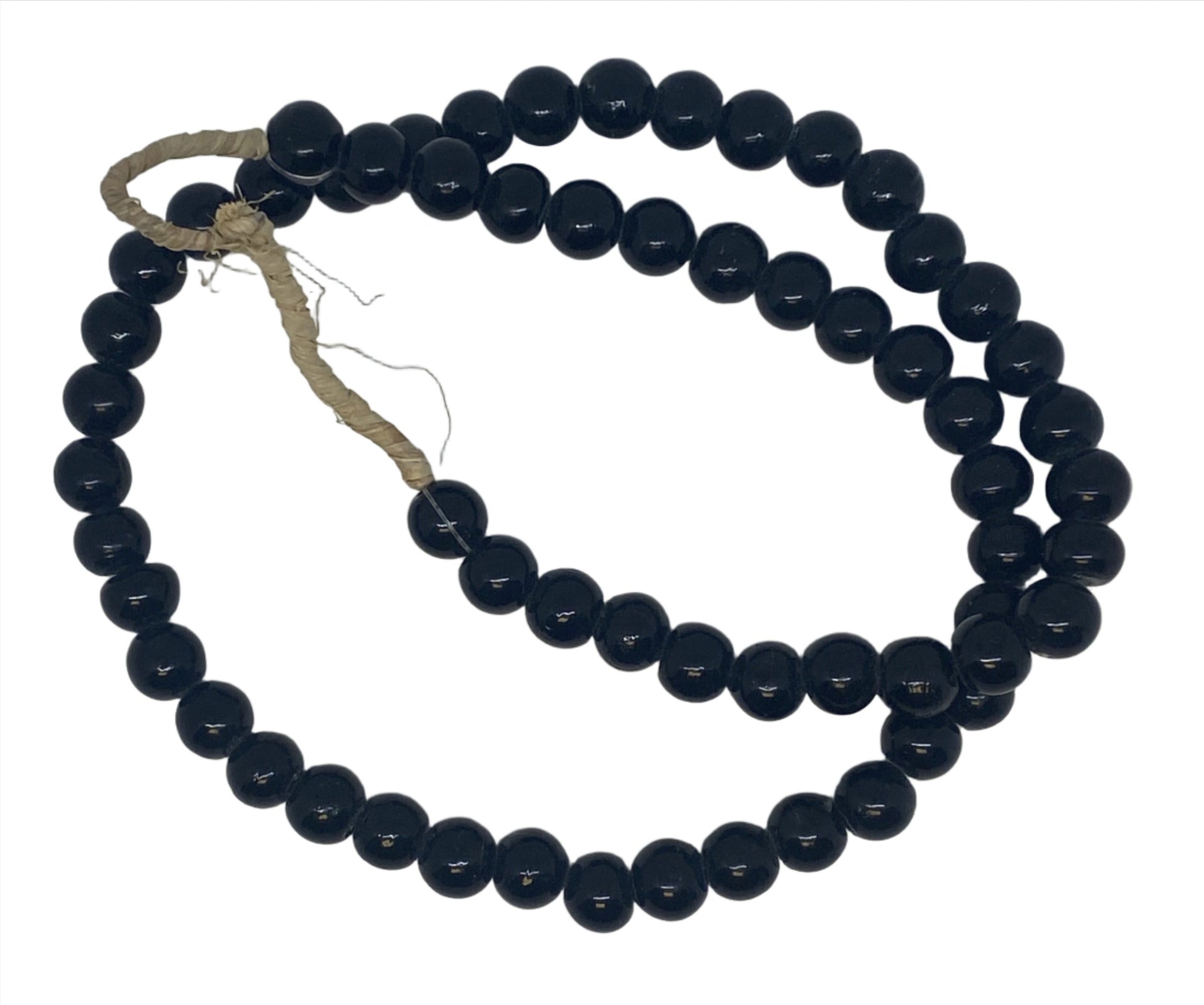 Opaque glass beads from Mali approx. 1/2” diameter each bead. Strand is about 26” long and has about 60 beads. Beads come strung on thread with a raffia closure and can be worn as a necklace or can be separated and made into your own creation.