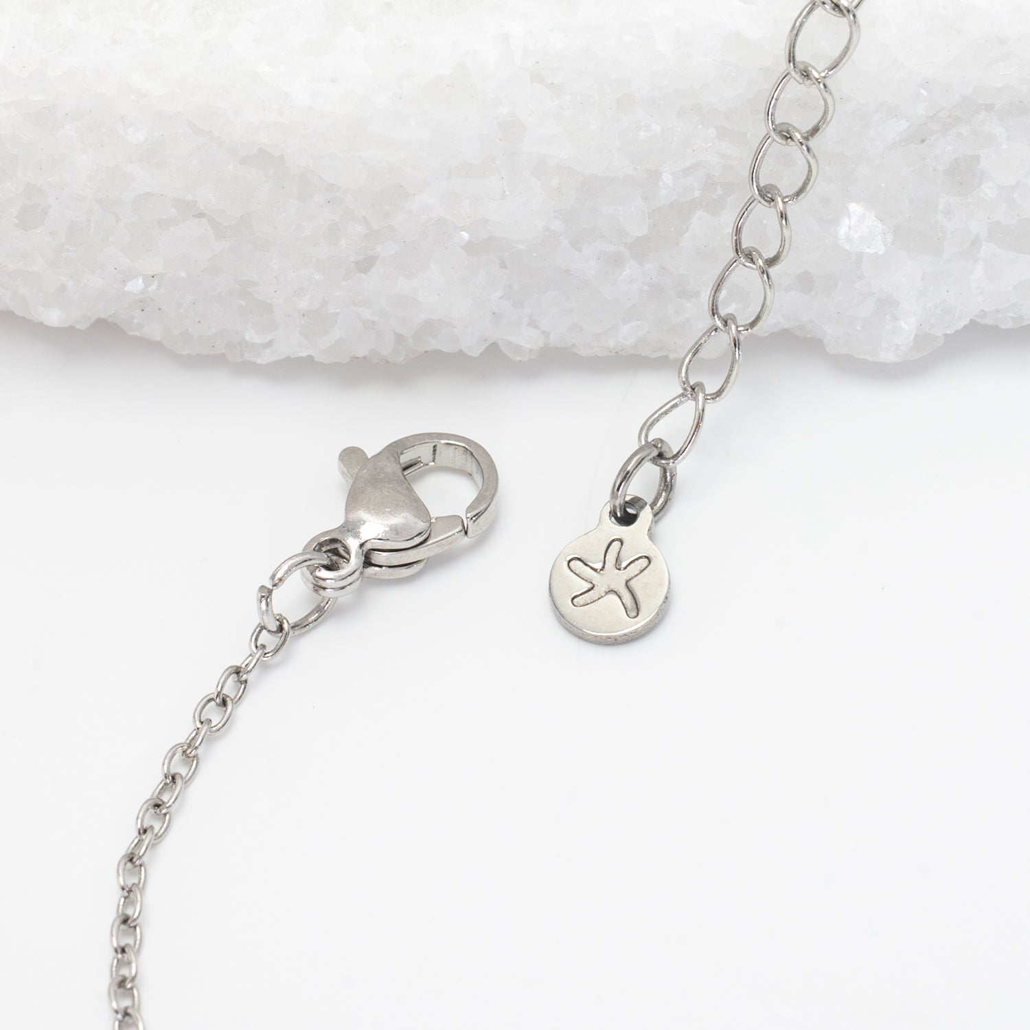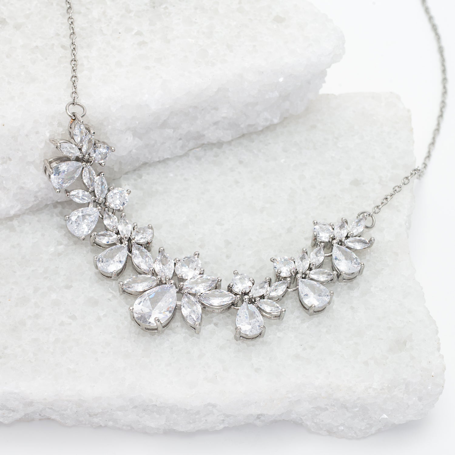 Meet the Glittering Garland Platinum and Zircon Necklace, a breathtaking and enchanting piece designed to adorn both brides and their beloved bridal party. This necklace exudes an air of elegance, radiance, and timeless beauty, making it the perfect accessory for your special day. Crafted in platinum and adorned with sparkling zircon gemstones, its graceful adjustable design drapes elegantly along the neckline, accentuating the natural beauty and grace of those who wear it. The Glittering Garland Platinum and Zircon Necklace is more than just an accessory; it is a reflection of your radiant spirit and the love that surrounds you. Its versatile design adds a touch of elegance to any bridal ensemble or formal attire, ensuring that you shine with unparalleled grace. Let the Glittering Garland Necklace be a symbol of unity, celebration, and cherished memories for your special occasion. Your Impact: With your purchase, you directly contribute to our mission of providing holistic care, vocational training, and career development for survivors. With your help, we can build a future where every woman can thrive and shine brightly as she creates her happily ever after. Box size and color may vary. Materials: Platinum plated brass chain with zircons necklace Hypoallergenic; lead and cadmium free with nickel content less than 100 ppm. Size: 19.5-23 inches