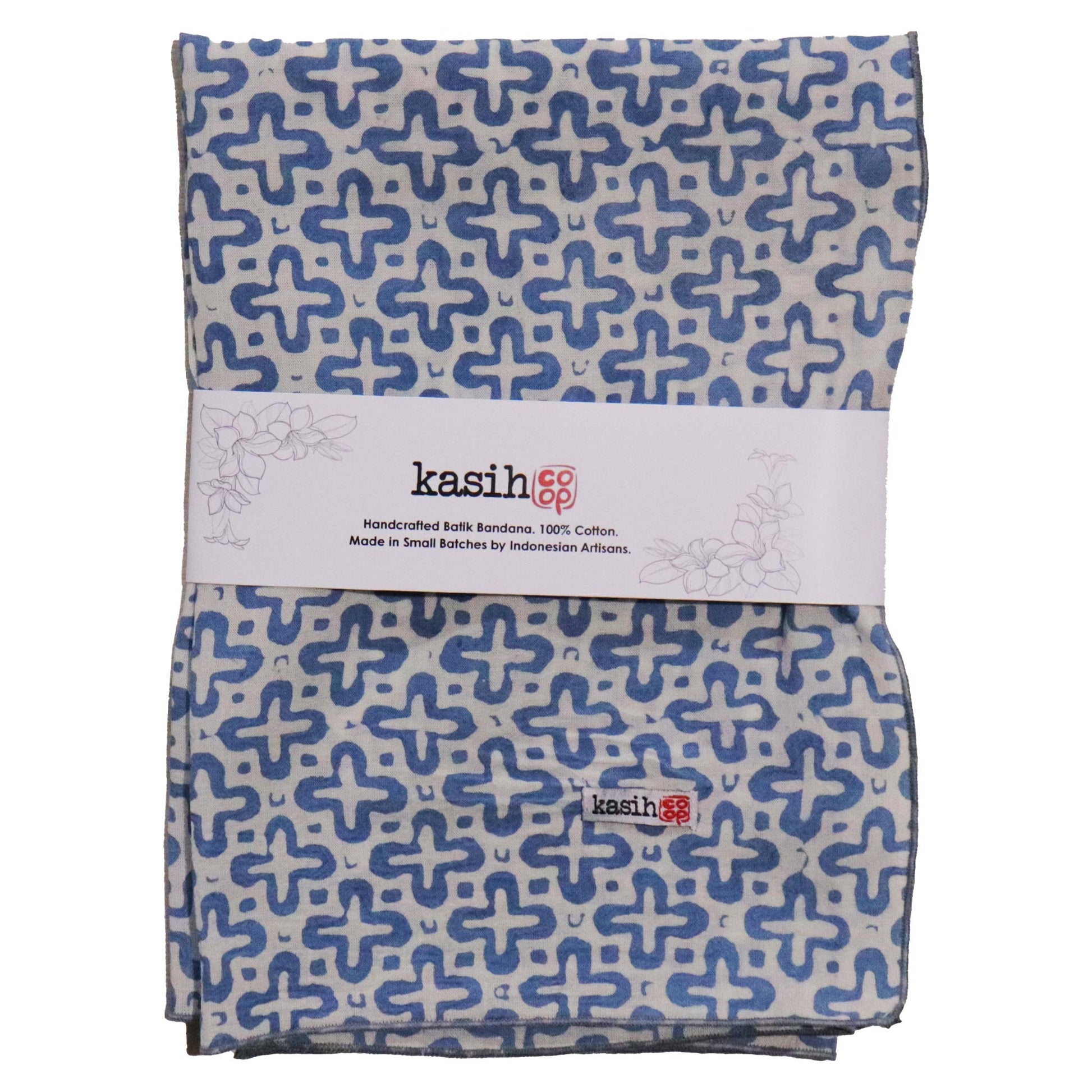 This is a hand-dyed and hand-stamped batik bandana, handmade by artisans using botanical natural indigo dye. This fabric is handmade by artisans in Java using centuries old wax & dye batik technique. Naturally dyed batik bandana with indigo plants This fabric is made from lightweight soft bandana fabric. This bandana is made from white cotton fabric that is then hand-stamped and hand-dyed using 700 years old batik wax and dye technique. The batik fabric is also then sun baked. You should expect some variation of the color. This batik pattern is called Indigo Cross, in blue, light blue. Size: 21.6" x 22.8" Made with cotton Machine washable in cold and air dry. Wash batik scarf separate from other garments. You can wear them as bandana around your neck, as a head and hair cover wrap or as a face mask. Also great bandana for your pet dog