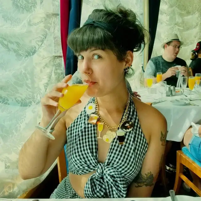 Celebrate the joy of brunch with this playful statement necklace! Laser cut from a vibrant mix of glitter, mirror, and opaque 1/8" acrylic sheets, backed with thinner white 1/16" acrylic, it captures the spirit of your favorite mid-morning feast. The pendant hangs from a thick gold chain measuring 16" with a 3" extender, letting you choose the perfect length to showcase your love for mimosas, waffles, and all things brunch.
