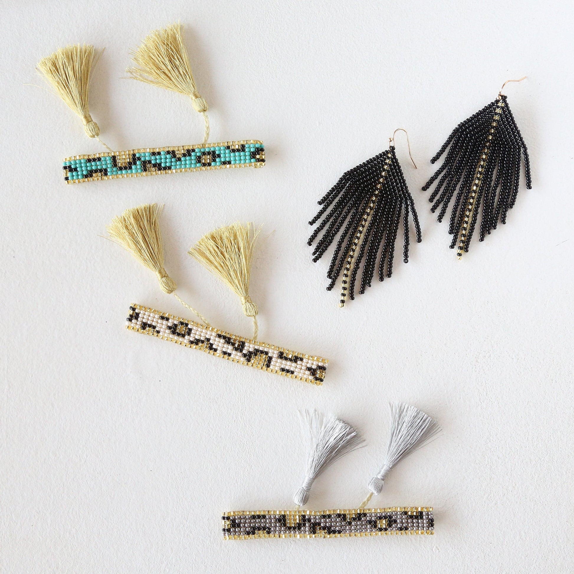 Beaded bracelet with leopard pattern in pearl, gold and black.