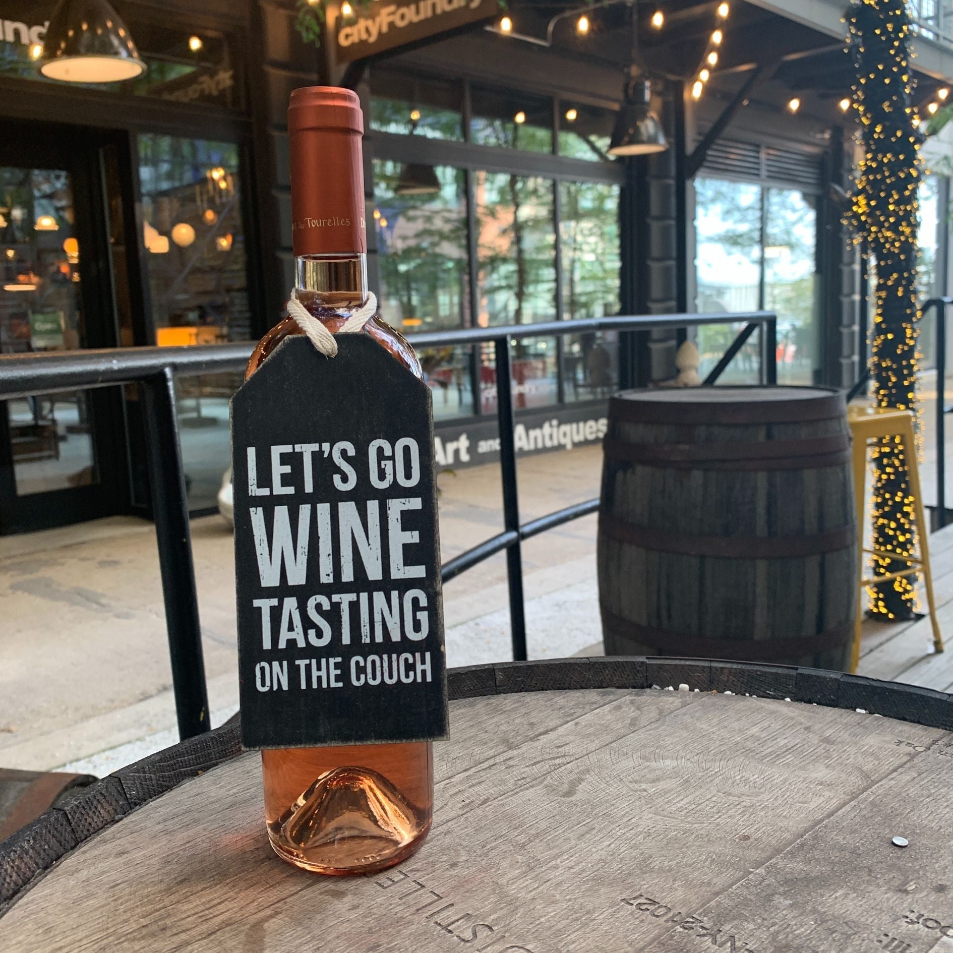 A wooden bottle tag that's perfect for any occasion featuring a distressed "Let's Go Wine Tasting on the Couch" sentiment with reverse black and white design. Contains top fabric loop for attaching to a wine bottle for gifting.