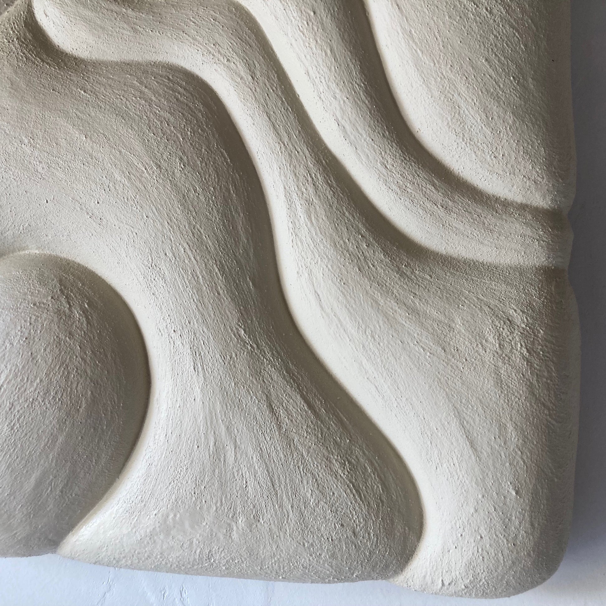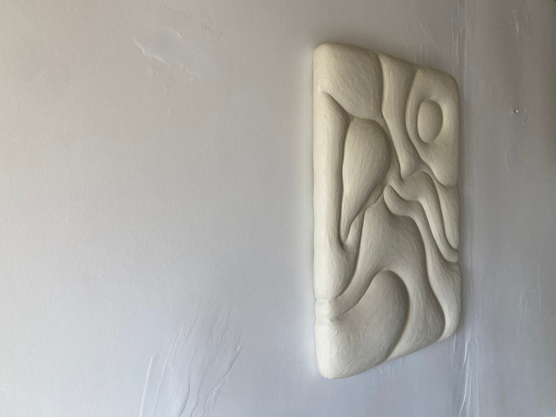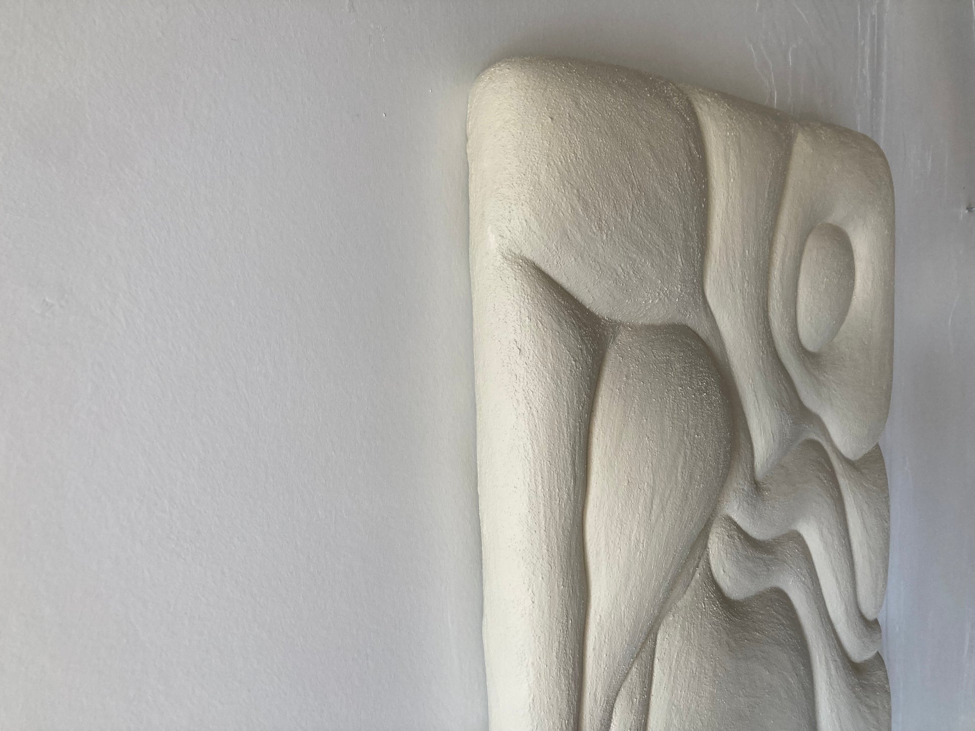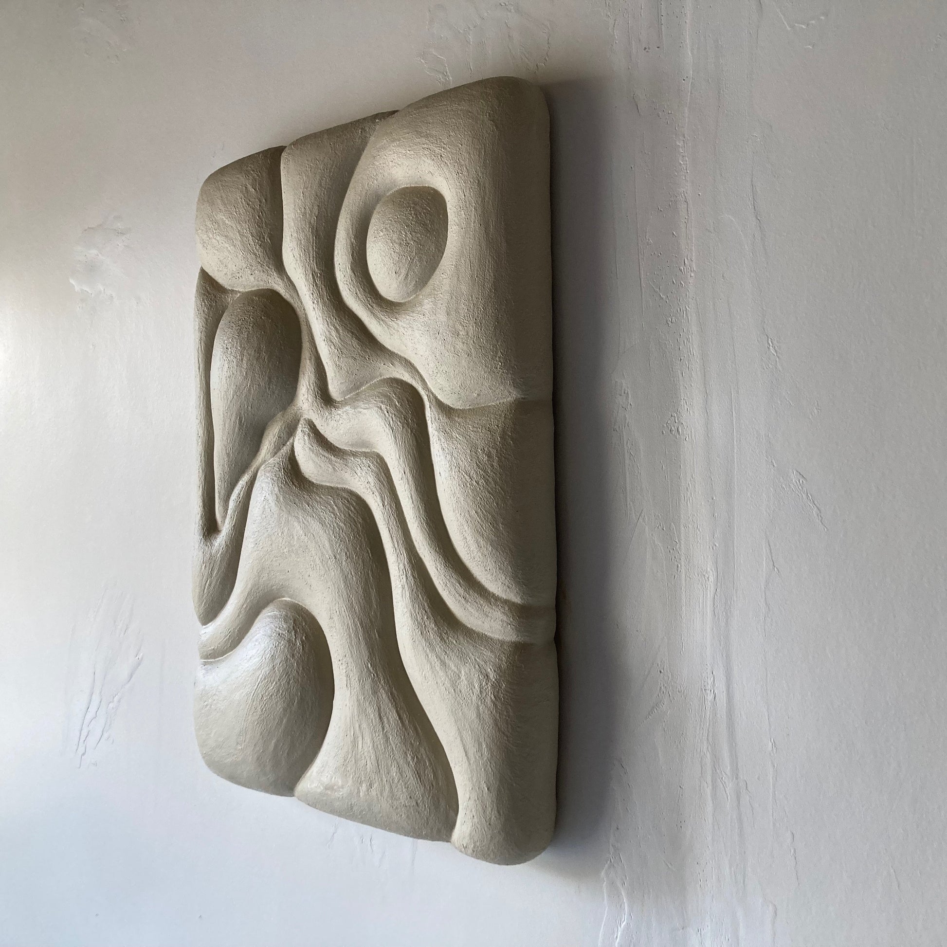 ‘Linger’ By Greyya Jay The lingering sunlight paints quiet shadows on this dimensional artwork. Relief wall art piece, hand sculpted in my Minneapolis studio. Textured, relaxed dimensional shapes. Due to the hand-sculpted nature, these can vary slightly. Creamy beige color. Simply message me for a different color or size. 19 inches wide, 25 inches tall. Depth ranges from 1-2.5 inches. Hanging hardware will be attached to the back.