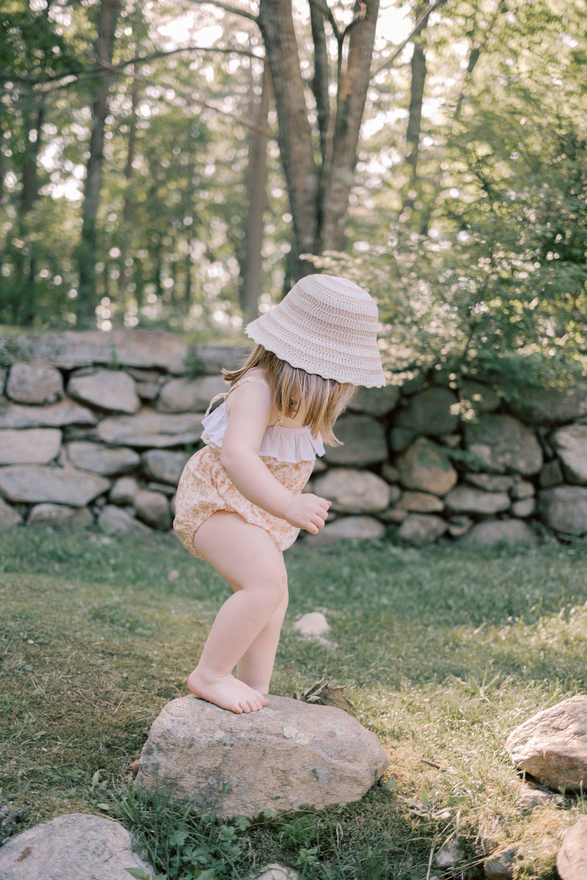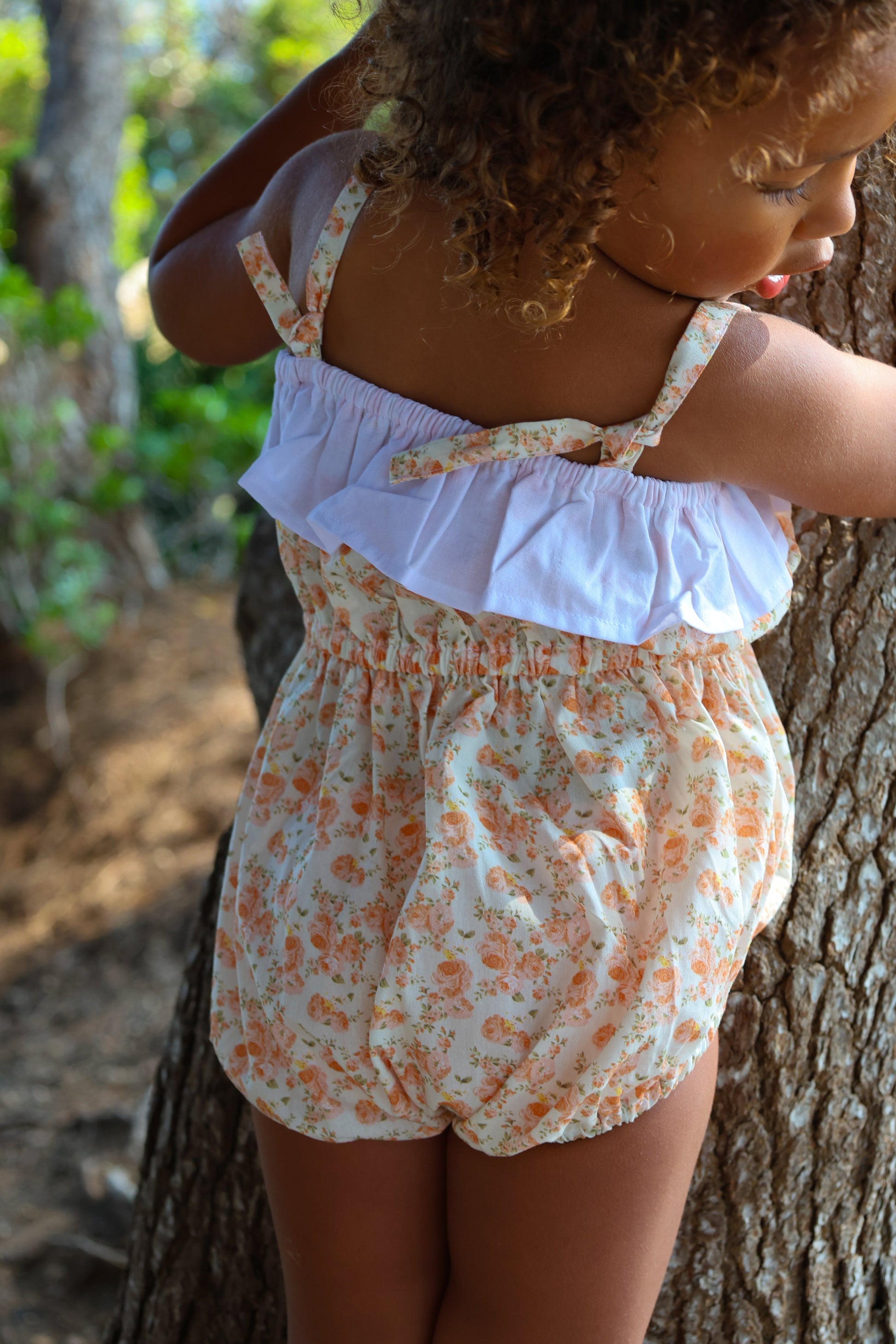 The classic white ruffled bodice adds a touch of vintage flair, while the elasticated waist and leg openings ensure a snug yet flexible fit. Perfect for picnics, beach trips, or backyard playdates, the Kaoru romper is a versatile summer essential.