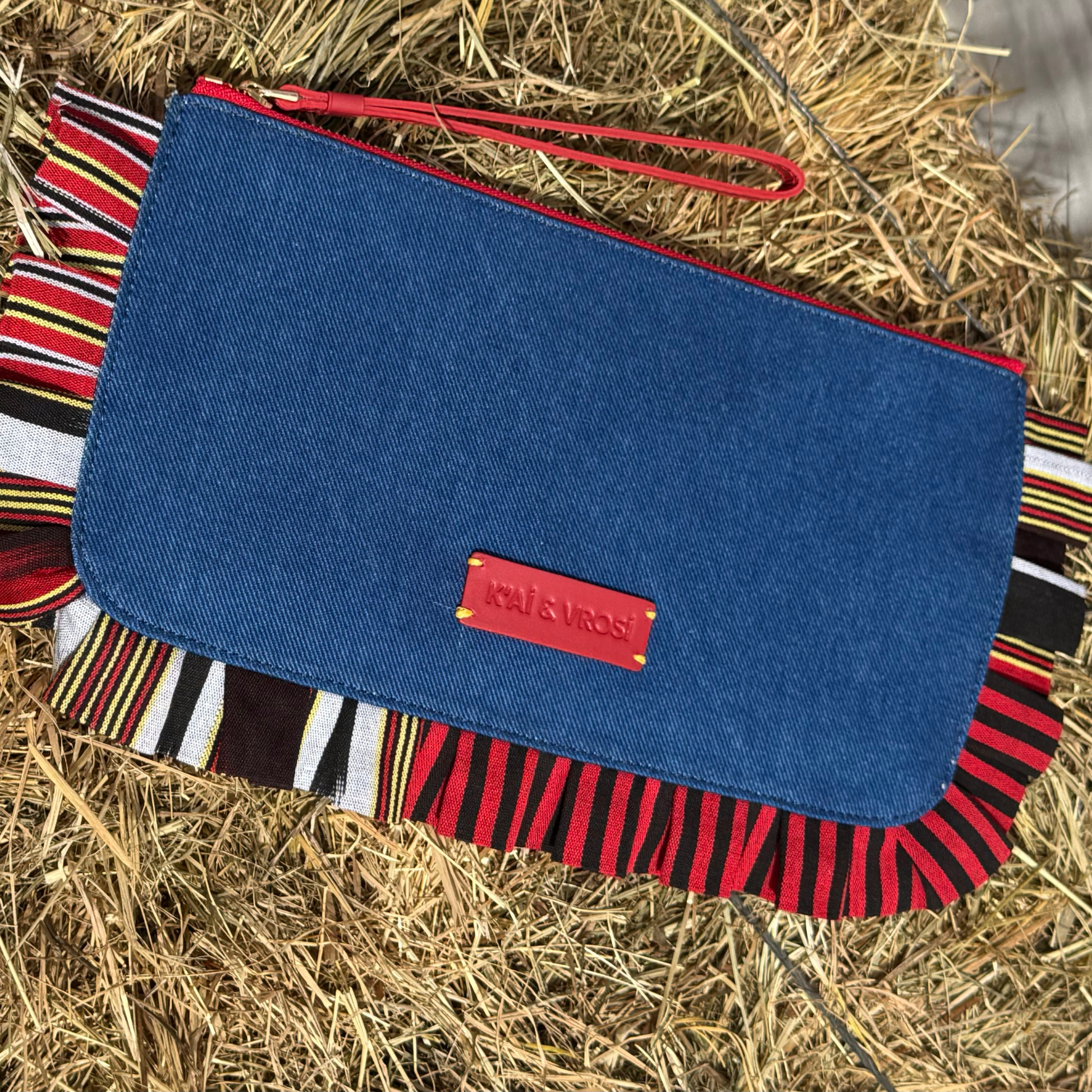 Meaning "hope", Medi denim clutch bag is for the summer. It is the season. With its colorful ruffle Medi is here to give you the energy and lightness the summer holds. With no so much effort, you will have the great look with even your plain outfit. The striped patterned ruffle may change in each bag. For us, this symbolizes the unique and special look of handwoven fabric. Size: 34 x 17 cm (ruffle included)
