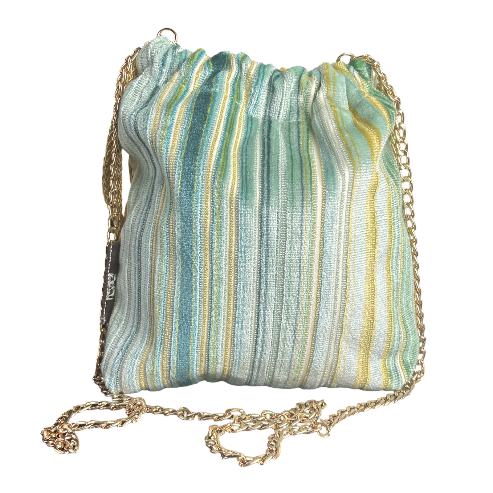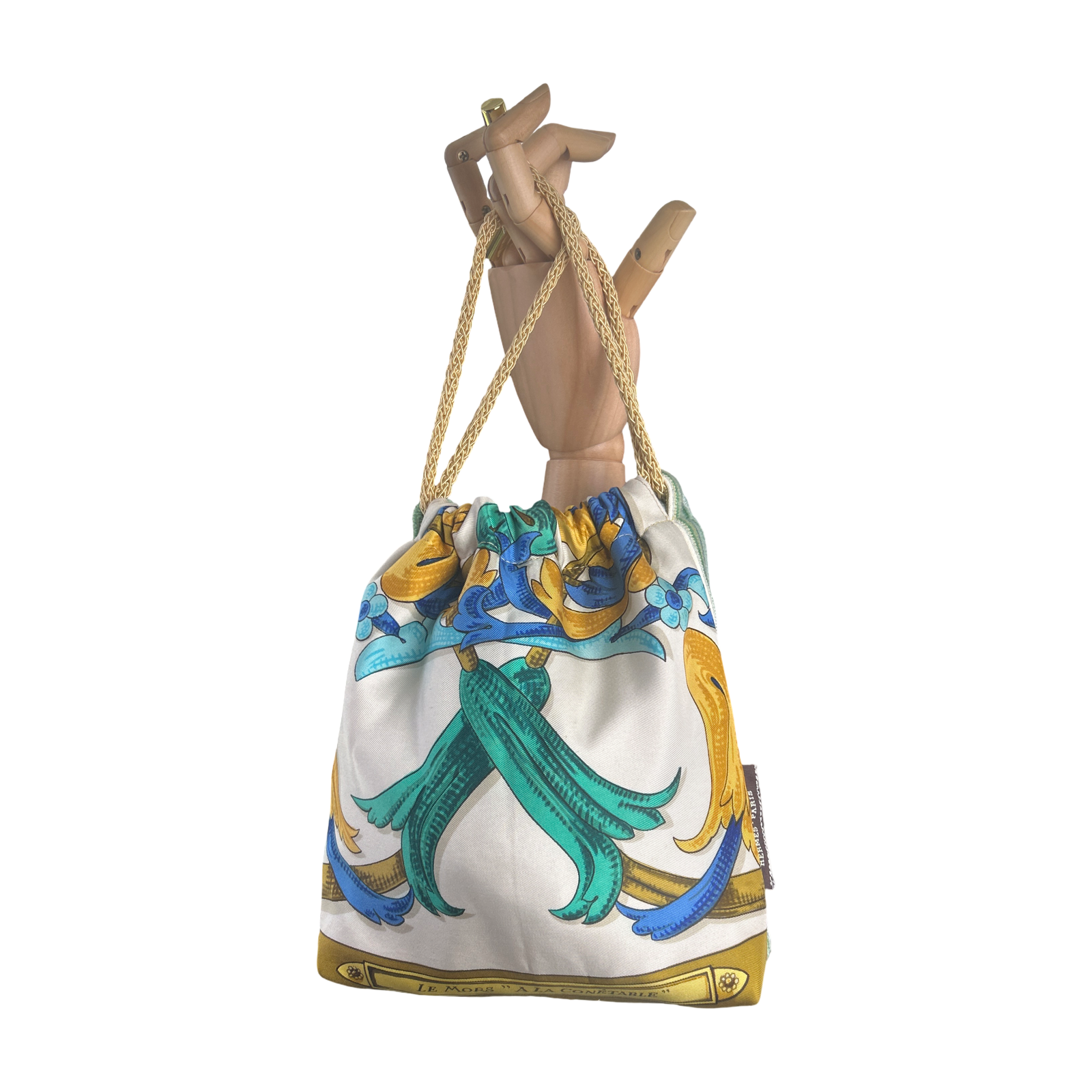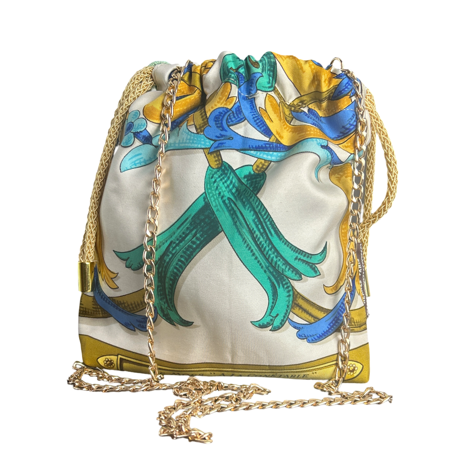 Reimagined from the world’s finest collection of vintage Hermès scarves, our drawstring bag is the ultimate accessory for your on-the-go lifestyle.  Uniquely convertible from a crossbody to a handheld bag with both goldtone chain and silky drawstring cord.