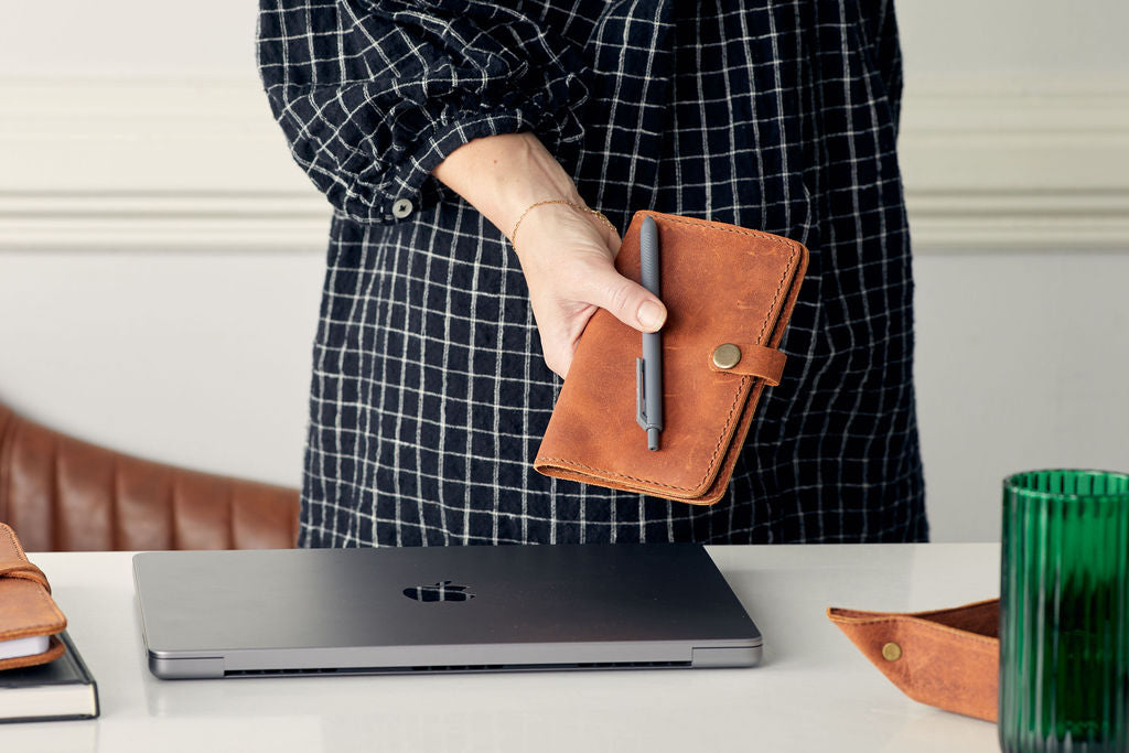 This pocket-sized journal cover is a sweet daily companion for your meeting notes, sketches, or thoughts. Tuck it under your arm or in your favorite bag and you'll be ready for whatever comes your way.