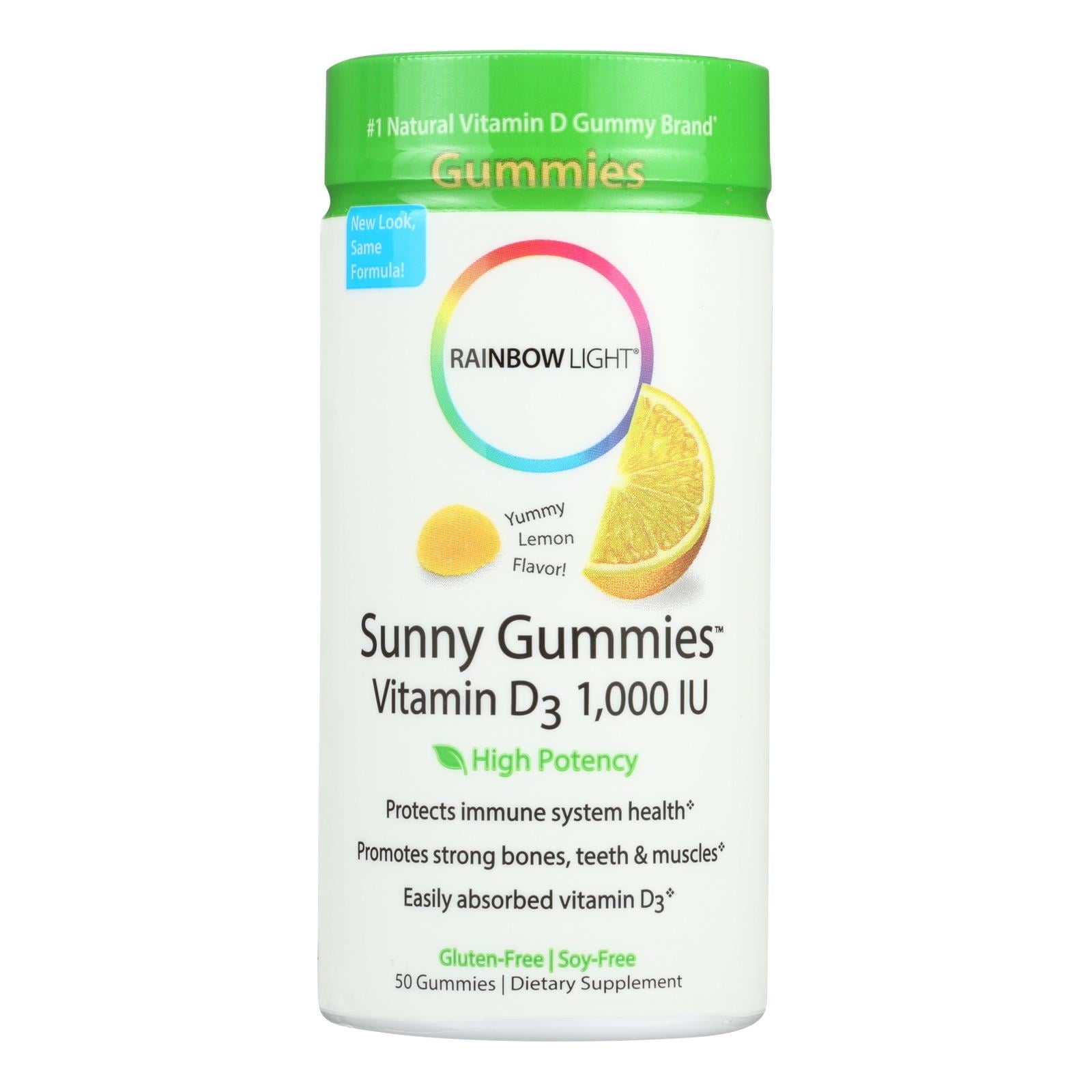 A yummy lemon gummy drop of vitamin D thats so tasty, youll look forward to taking it daily. Rainbow Light Sunny Gummies Vitamin D3 are delicious lemon-flavored gummies for adults. Vitamin D is essential to nearly every organ and system of the body, from the bones and muscles to the immune system, brain and heart. Yet many adults do not get enough vitamin D from sunshine or diet alone. Each multivitamin gummy contains 1,000 IU of a high potency source of vitamin D3, which is 125 percent of the daily value of this important nutrient. These Rainbow Light gummy vitamins are made with color from a natural source of turmeric. These vitamin D gummies for adults are also gluten and free of common allergens like soy, peanuts, eggs and fish. These D3 vitamin gummies contain no artificial sweeteners and come in bottles made from recycled materials. Rainbow Light Sunny Gummies will help shine your light. Packaging may vary. *These statements have not been evaluated by the Food and Drug Administration. This product is not intended to diagnose, treat, cure or prevent any disease.