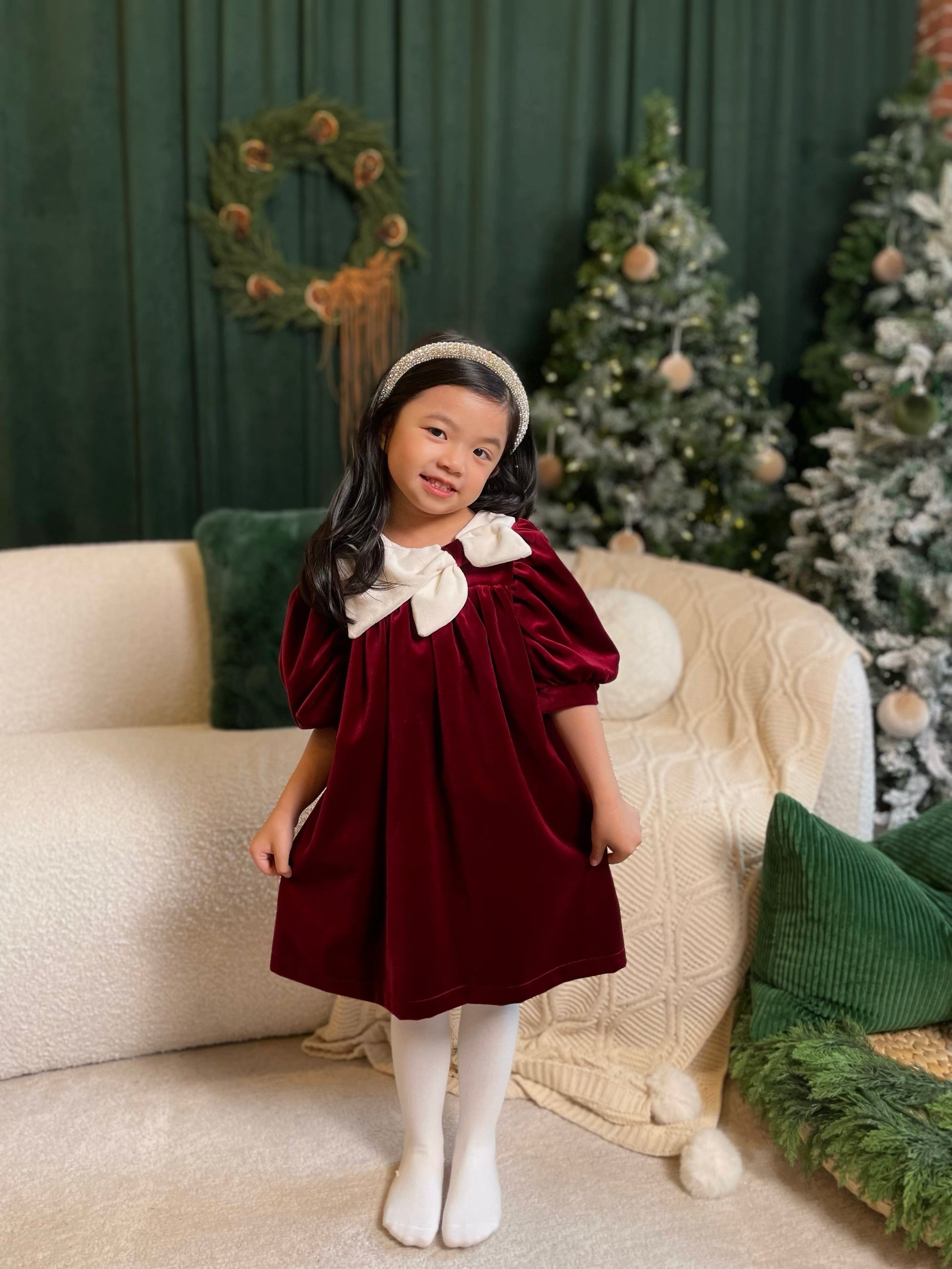 A classic holiday keepsake, designed to be as luxurious as it is nostalgic.... The Rosemoor Dress is crafted from 100% cotton velvet in a rich winterberry red hue, soft weighty and beautifully plush. It’s oversized ivory bow and gently puffed sleeves bring a touch of vintage charm, while the fully lined design ensures comfort for little ones through every festive gathering. At the back, three covered velvet buttons add a delicate finishing touch, completing the design with quiet elegance. The Rosemoor dress is carefully made to last, intended to be treasured, worn, and lovingly passed down. Complete the look with the matching Rosemoor Headband, crafted entirely from the same cotton velvet, the perfect keepsake accessory for the season. Care Instructions: The Rosemoor Dress is crafted from 100% cotton velvet, a rare, natural fiber known for its beautiful texture and timeless drape. To preserve its heirloom quality, please handle with care: Do not machine wash or tumble dry. Spot clean only using a soft, damp cloth and mild detergent when necessary. For a full refresh, professional dry cleaning is recommended. Store on a padded hanger or folded gently in tissue to prevent crushing the velvet pile. Avoid prolonged exposure to direct sunlight to maintain the rich color. With proper care, your Rosemoor Dress will remain a cherished keepsake for years to come.