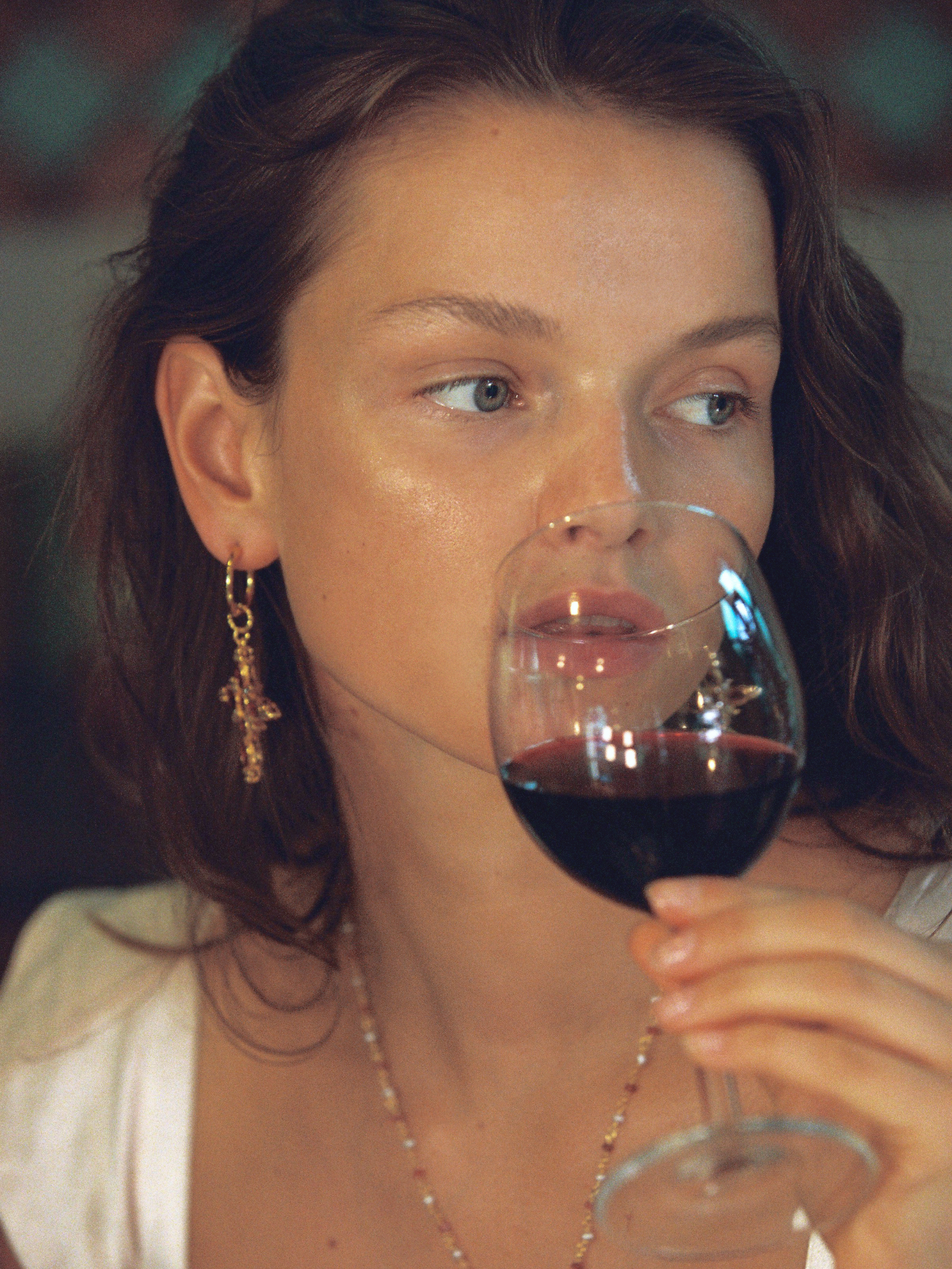 Features a pair of small nailhead hoops with deep ruby red & crystal CZ-adorned cross charms. Made from 18K gold-dipped brass.