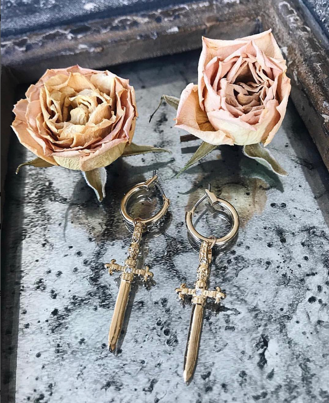Features a pair of small hoop earrings with lever-back closures, hung with lightweight dagger charms which feature a tiny skull, fleur-de-lis handles, and a crystal CZ at its center. Made from 18K gold-dipped brass.