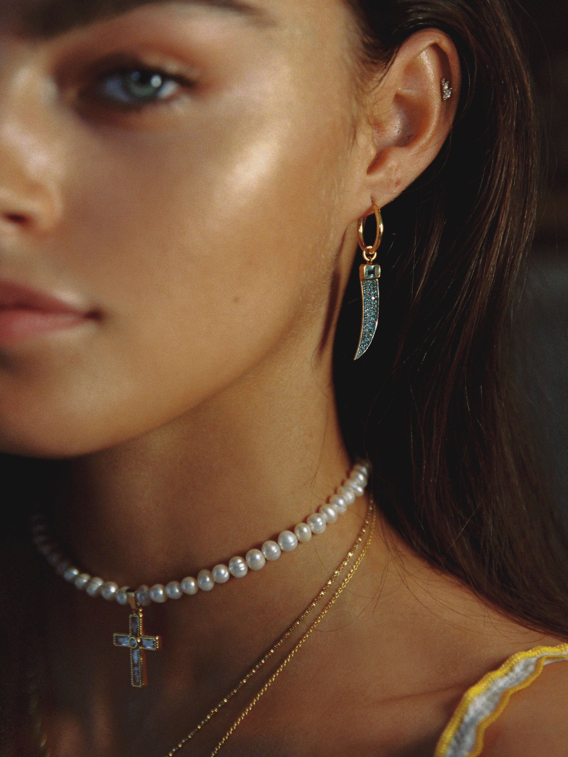 Features a stunning freshwater pearl adjustable choker necklace, centered by an Art Deco inspired crystal CZ cross charm. Made from 18K gold-dipped brass.