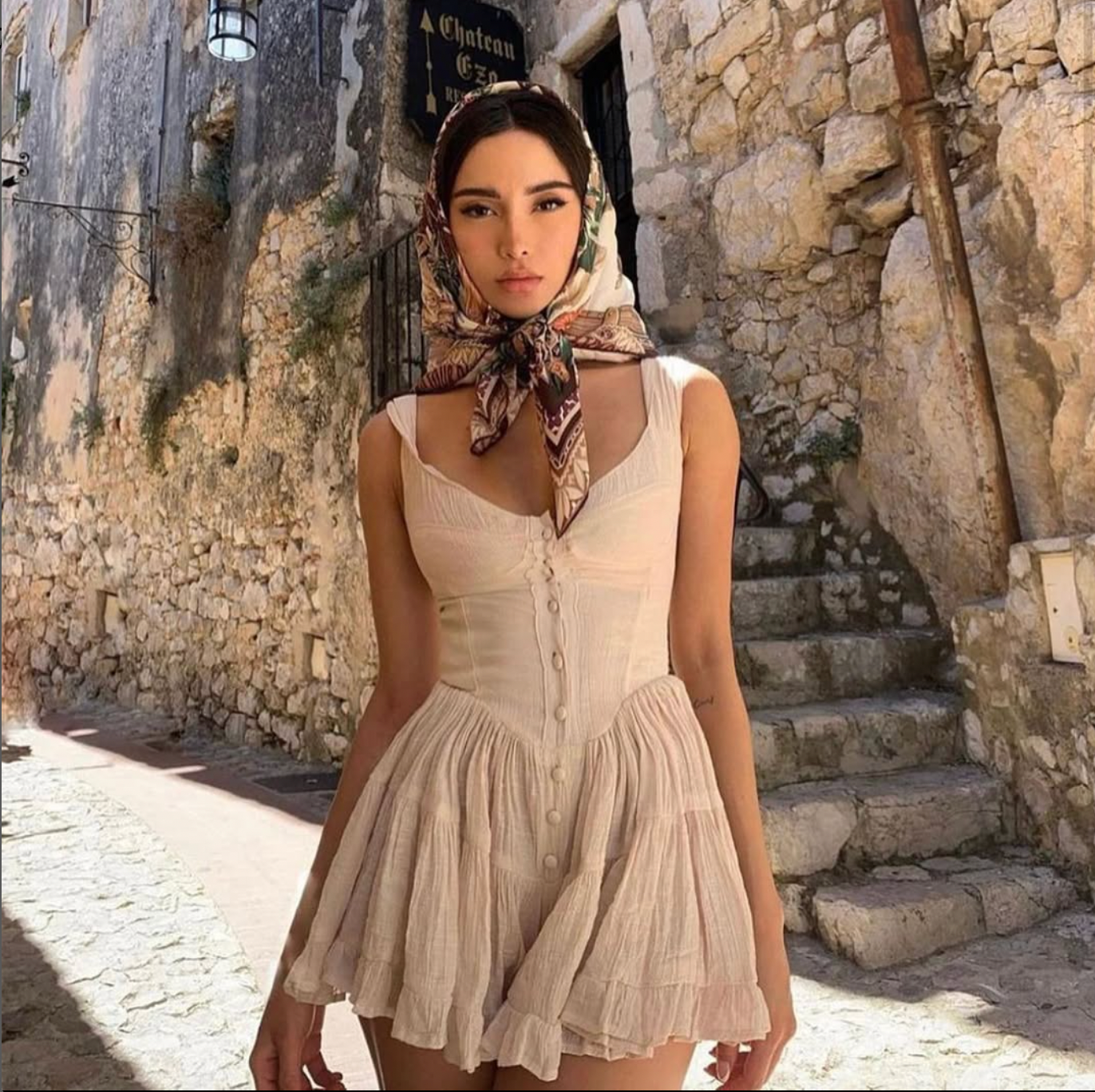 The most darling bustier romper dress. Slightly off-the-shoulder straps, with a slimming waist and a button-down closure along the front. The bottom fits like a romper, with a flattering & flowy mini-length skirt.