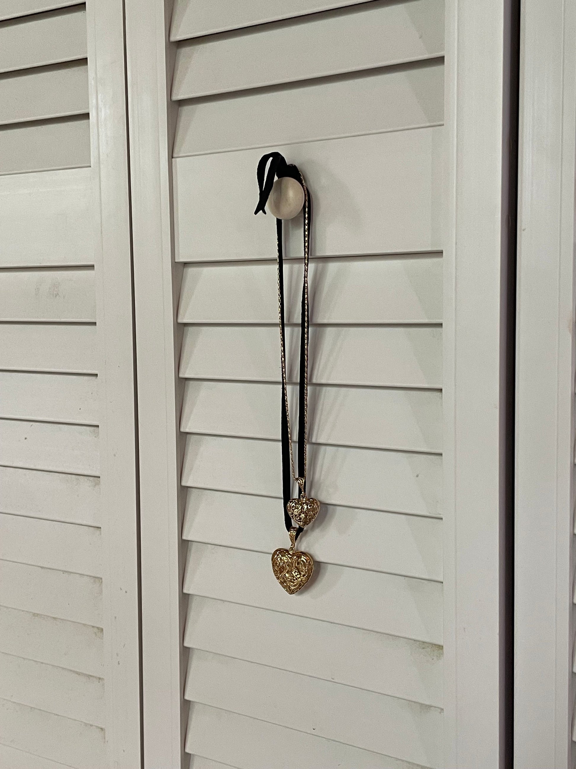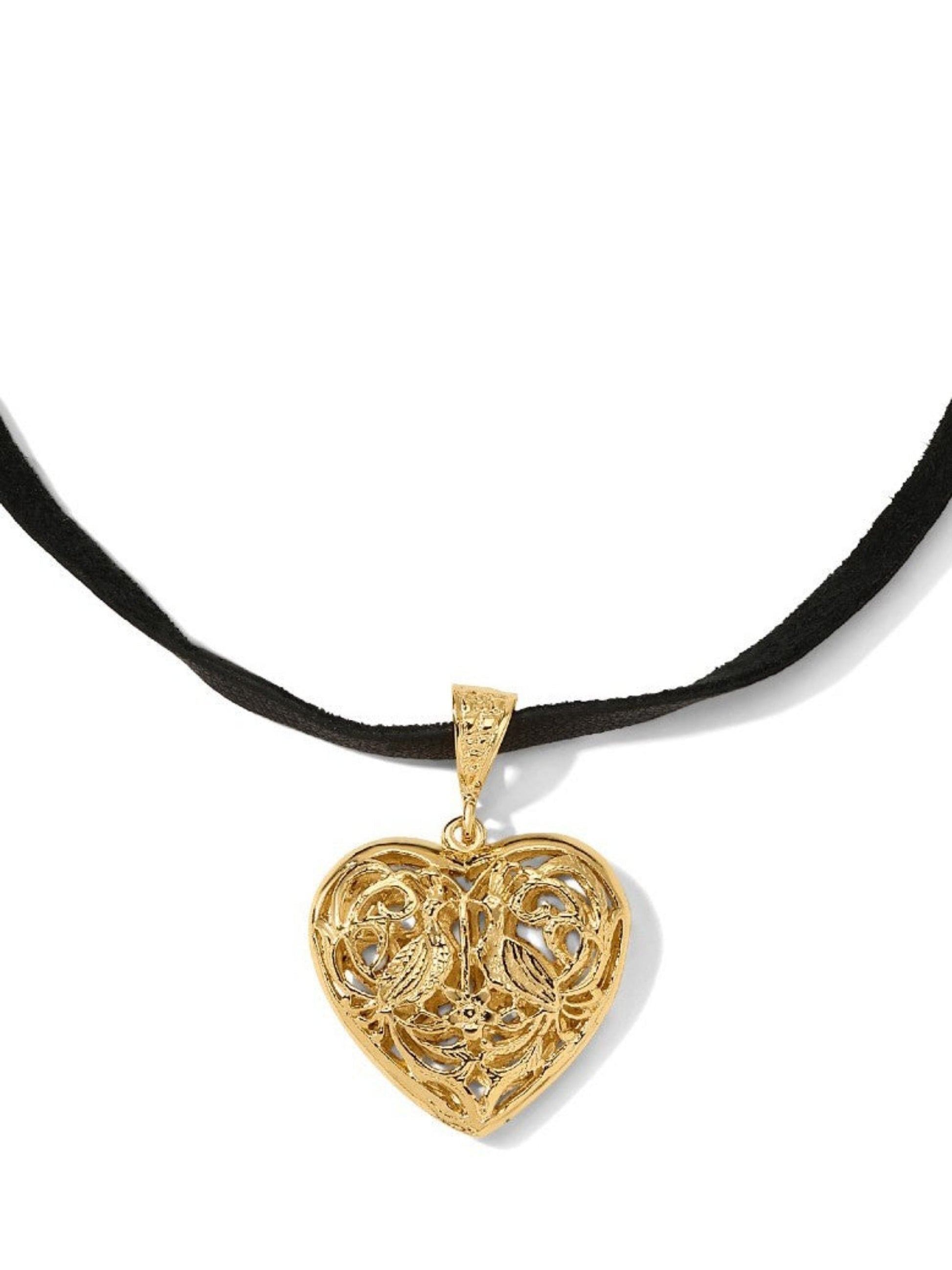 The Lana Choker features an 18K Gold cut-out Bird & Heart Pendant on soft black leather
