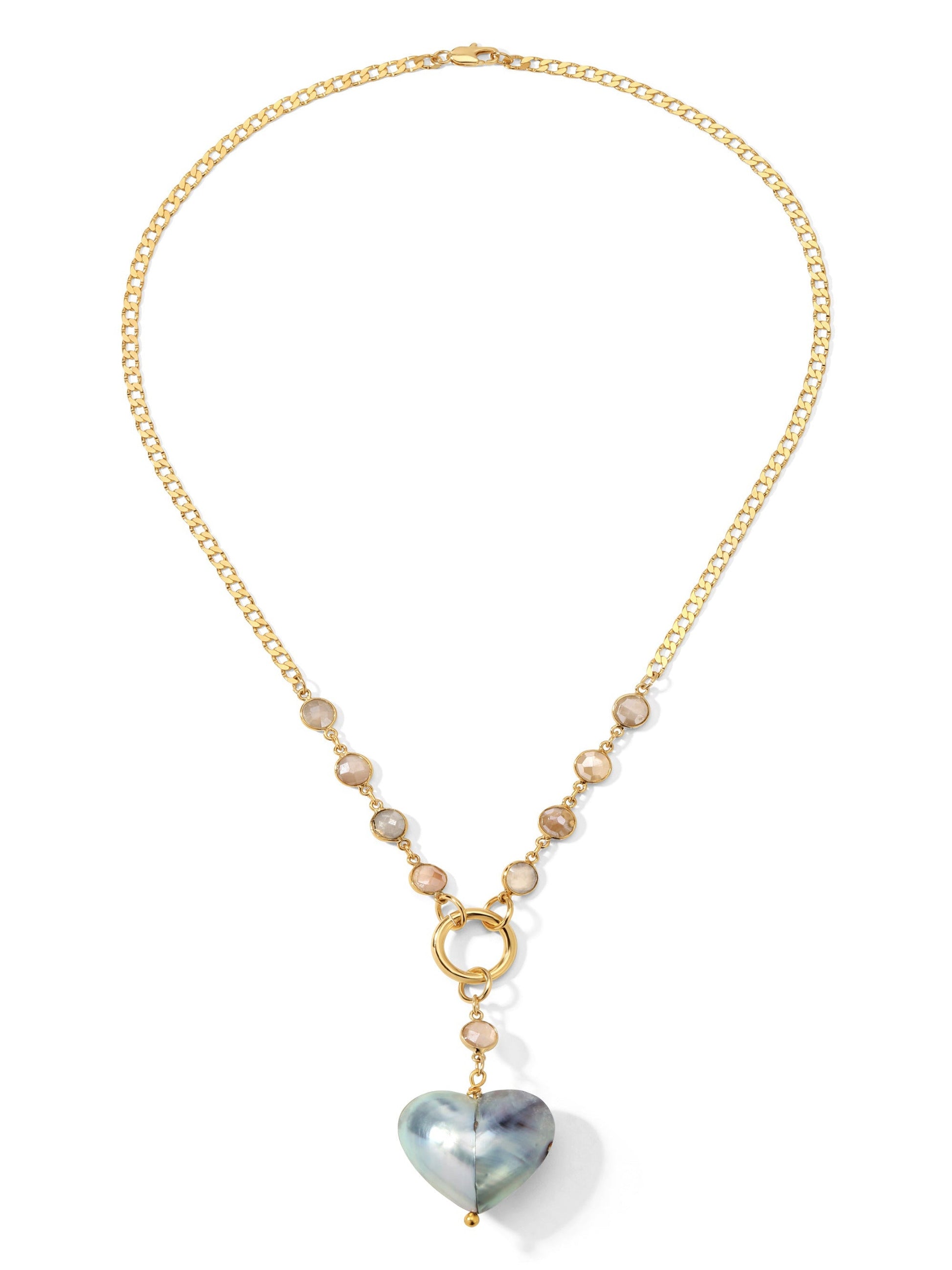Introducing The Mishka Necklace. Features a silver grey mother of pearl puffy heart pendant with Moonstone Bezels & an 18K Gold Ring & Chain Necklace. A unique necklace you will never want to take off.