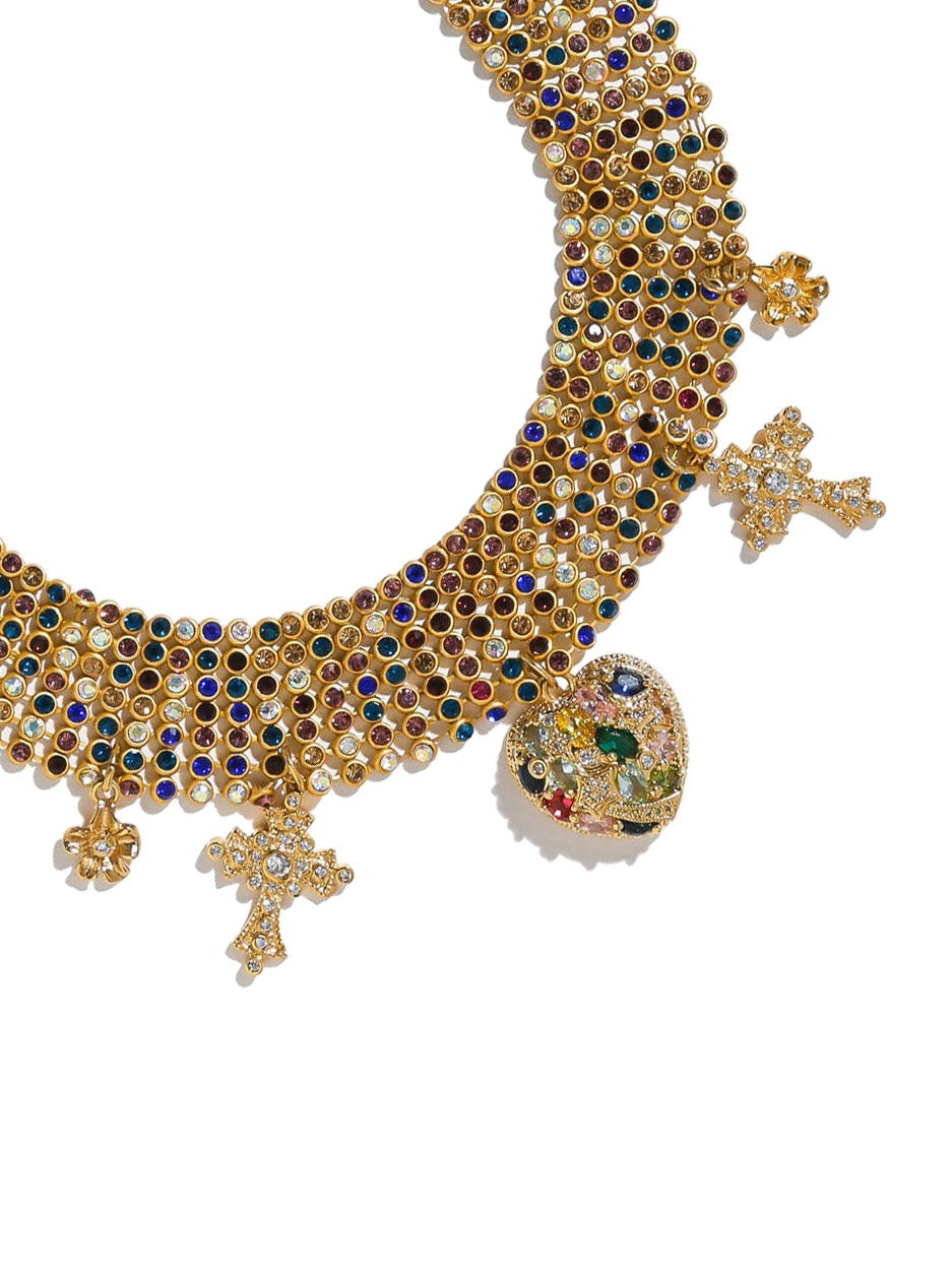 Features a multi-colored gemstone mesh collar choker necklace with ornate CZ-studded crosses, flowers & a jewel-toned heart charm. Made from 18K gold-dipped brass and finished with a lobster clasp closure and extender chain.