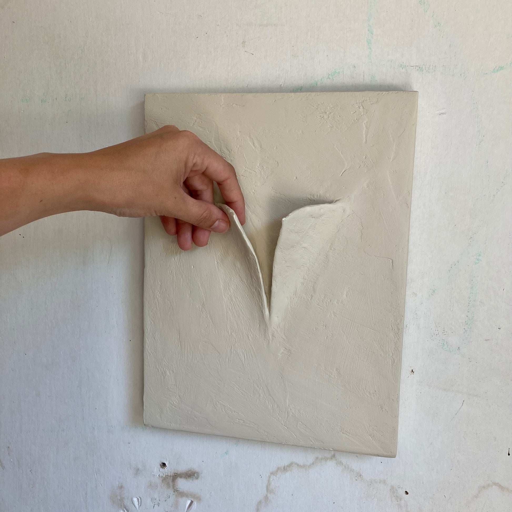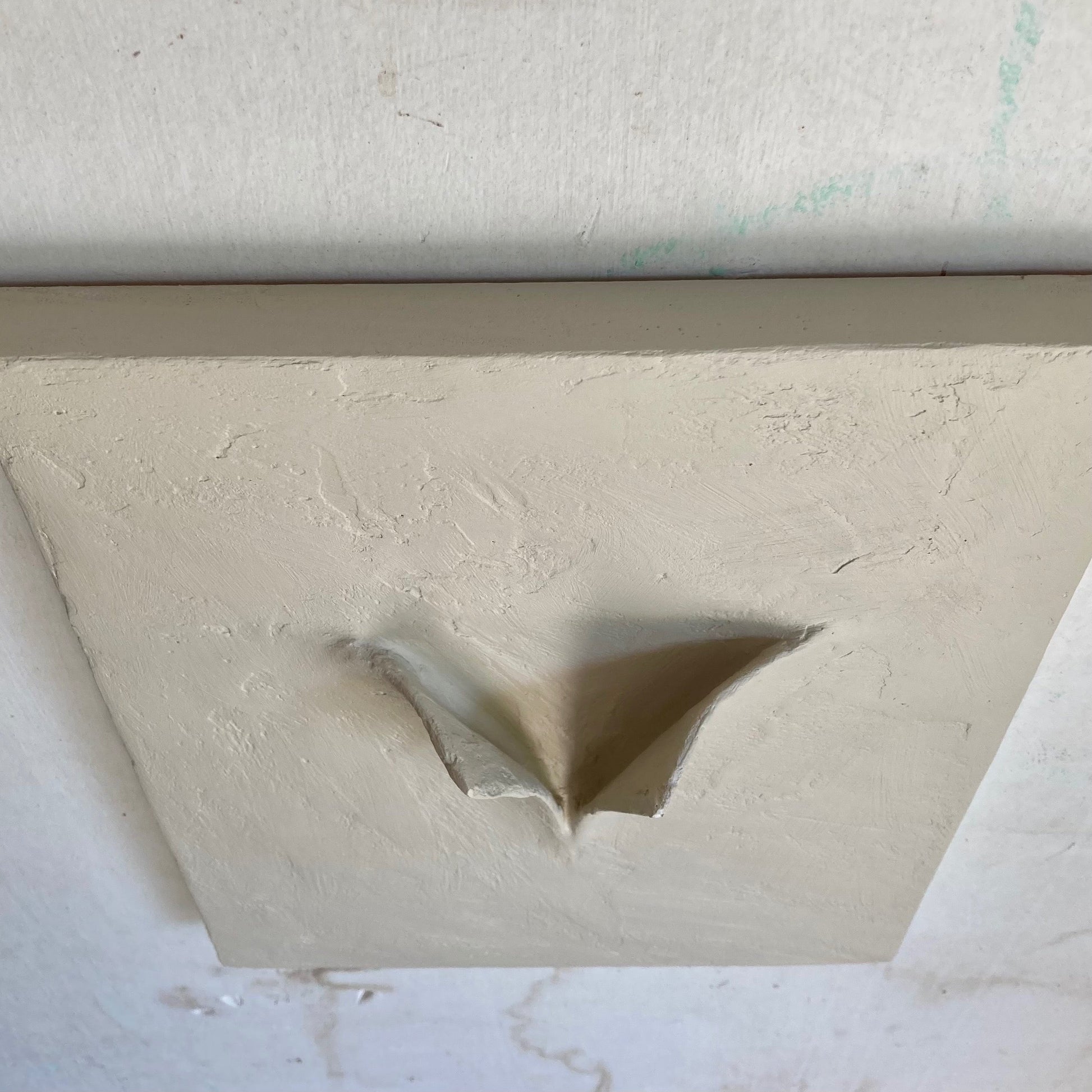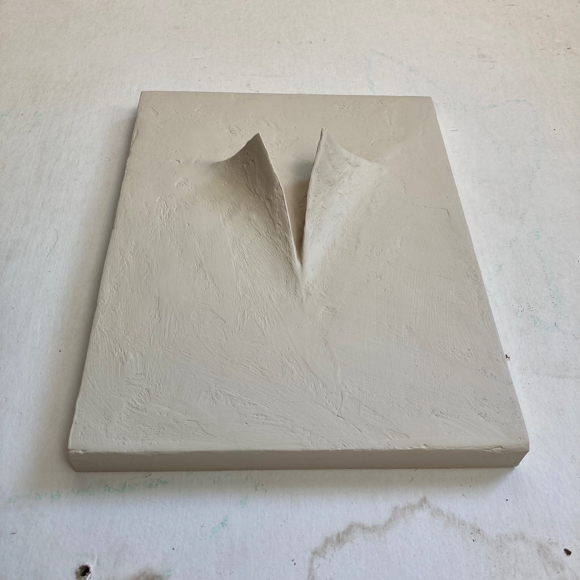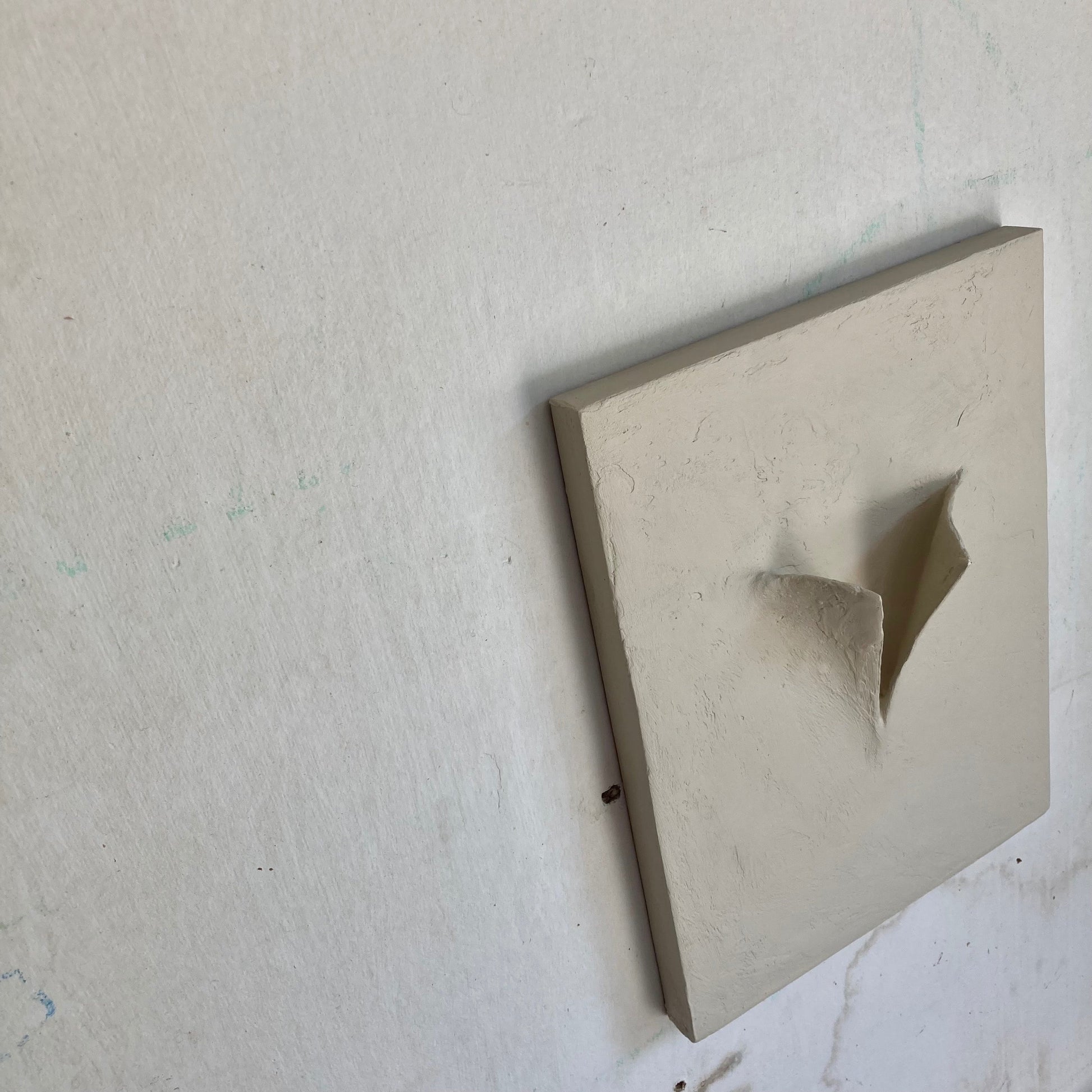 ‘Unadorned’ By Greyya Jay The excess has been stripped away, commanding attention with simplicity. Textured, relaxed dimensional sculpture. Due to the hand-sculpted nature, these will vary slightly. Creamy beige color. 9 inches wide, 12 inches tall. 1 inch deep. Made with cement, fiber and acrylic paint. Hanging hardware will be attached to the back.