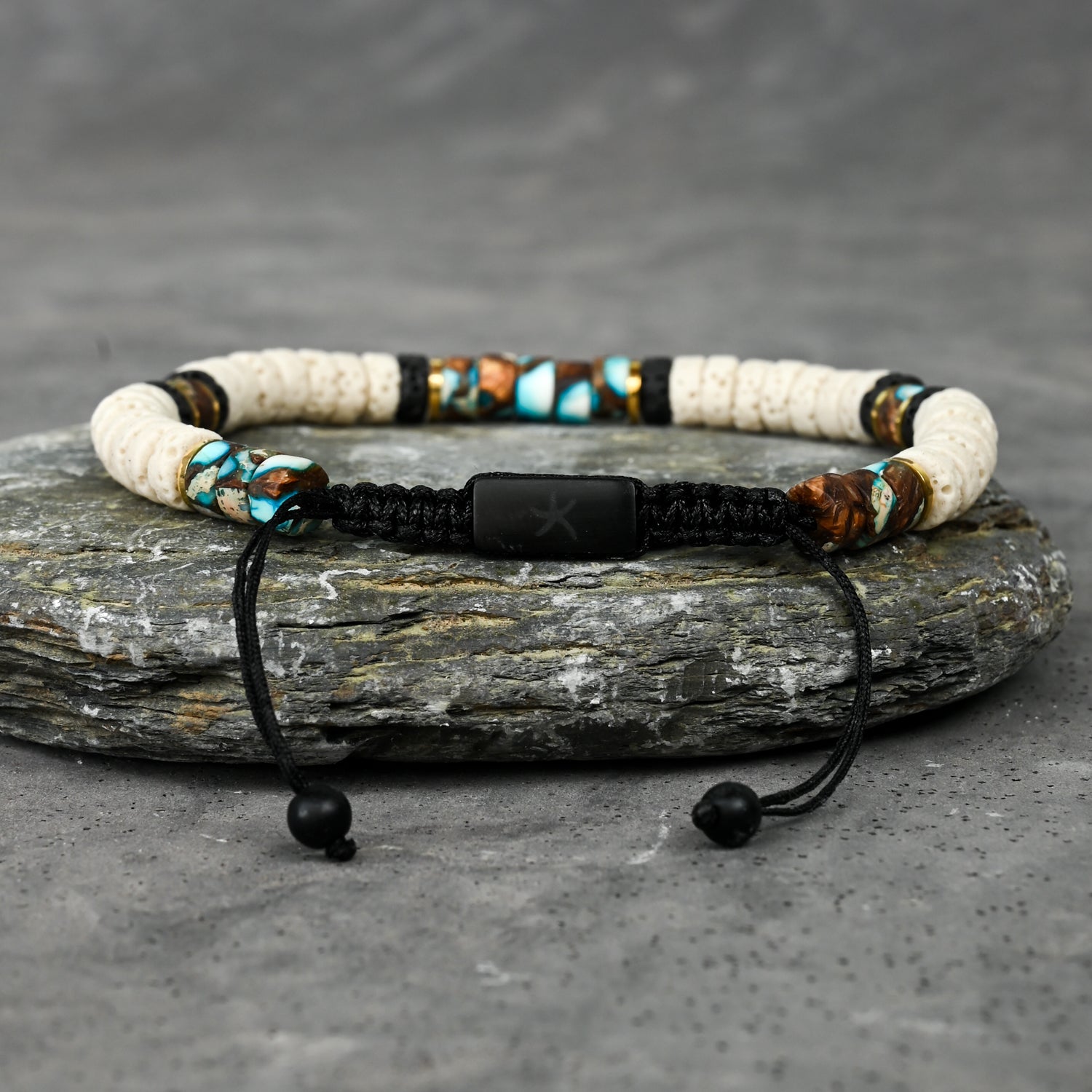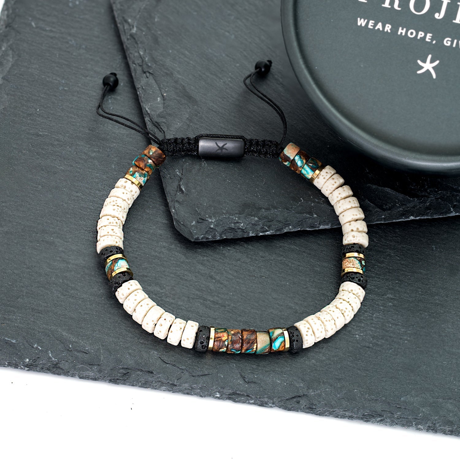 Strength, resilience, and boldness come together in the Vanguard Lava Bead Bracelet. Crafted with textured beige and black lava beads, accented by the striking blue, red, and bronze hues of emperor stone, this bracelet embodies the spirit of a true leader. Designed to be a symbol of confidence and power, the Vanguard Lava Bead Bracelet adds a rugged yet refined edge to any look. Whether worn as a statement piece or layered with other favorites, its adjustable fit ensures comfort and versatility. As part of the Starfish Project collection, your purchase restores hope to survivors on their journey to freedom, providing them with opportunities for a new beginning. Wear or gift the Vanguard Lava Bead Bracelet and carry a reminder of strength and leadership, knowing your choice makes an impact. Available at an exclusive price in our beautifully paired ready-to-gift sets! The Trailblazer Men’s Gift Set The Vanguard Lava Bead Men’s Gift Set Box size and color may vary. Materials: 14k gold plated stainless steel lava beads bracelet Hypoallergenic; lead and cadmium free with nickel content less than100ppm. Size: 9 inches