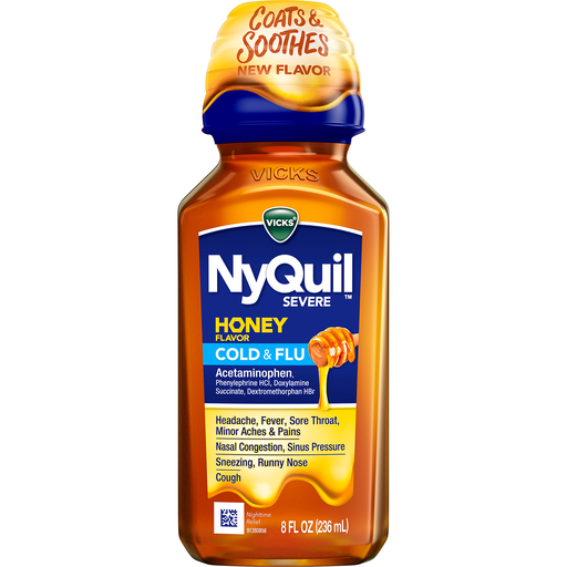 GREAT-TASTING HONEY FLAVORED NYQUIL. Get the same cold & flu relief you expect from NyQuil SEVERE in a great-tasting honey-licious flavor. POWERFUL, MAXIMUM STRENGTH 9-SYMPTOM RELIEF. NyQuil SEVERE Honey relieves coughing, sneezing, stuffy nose, minor body pain, sinus congestion, sinus pressure, sore throat, headache, and fever. POWERFUL NIGHTTIME COLD & FLU RELIEF. NyQuil SEVERE Honey formula is flavored with real honey and temporarily relieves common cold & flu symptoms so you can get the rest you need. FAST RELIEF SO YOU CAN SLEEP. Don't let your cold keep you up. Just one dose of NyQuil SEVERE Honey starts working fast to provide effective cold & flu relief. WORLD'S 1 SELLING OTC COUGH AND COLD BRAND. Vicks has been trusted for over 125 years to relieve your worst cold & flu symptoms.