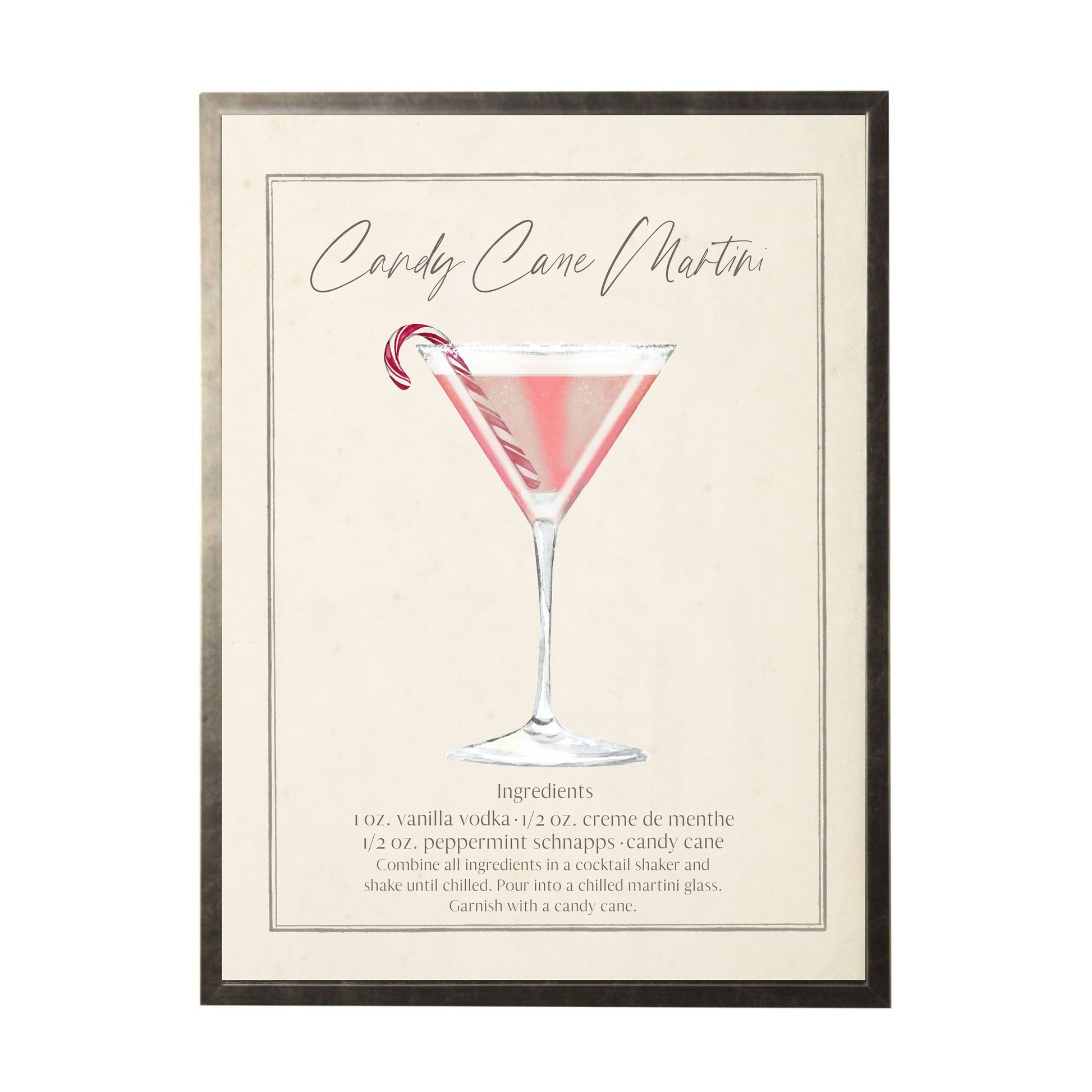 This vintage-inspired print, framed in a pewter frame, features a watercolor candy cane martini cocktail and recipe. Sized at 13 inches by 17 inches, this made in the USA frame makes for a beautiful addition to any wall. Made in USA Made with real wood Hangs from back-mounted hardware Encased in glass