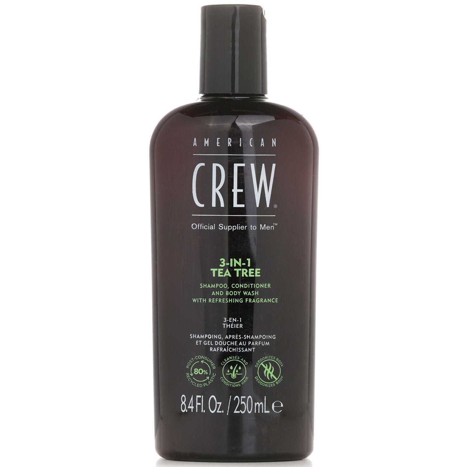 The 3-in-1 Tea Tree fragrance shampoo, conditioner, and body wash cleanses and moisturizes hair and body, providing a rich lather that removes dirt, sweat, and styling products.
