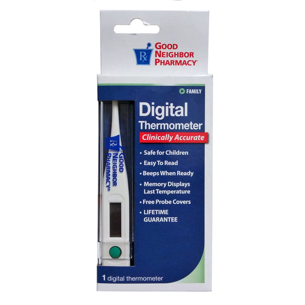 Safe for Children. Easy to Read. Beeps when Ready, Memory Displays Last Temperature. Free Probe Covers. No Glass or Mercury. Directions: Certified Accurate: Meets or exceeds ASTM and NIST accuracy standards for clinical thermometers. Free probe covers included to help prevent the passing of germs. Easy to use: Press the button and place in mouth. Display beeps and stops flashing when ready. Remember to carefully read enclosed instructions prior to use. Automatically shuts off if left on for nine (9) minutes.