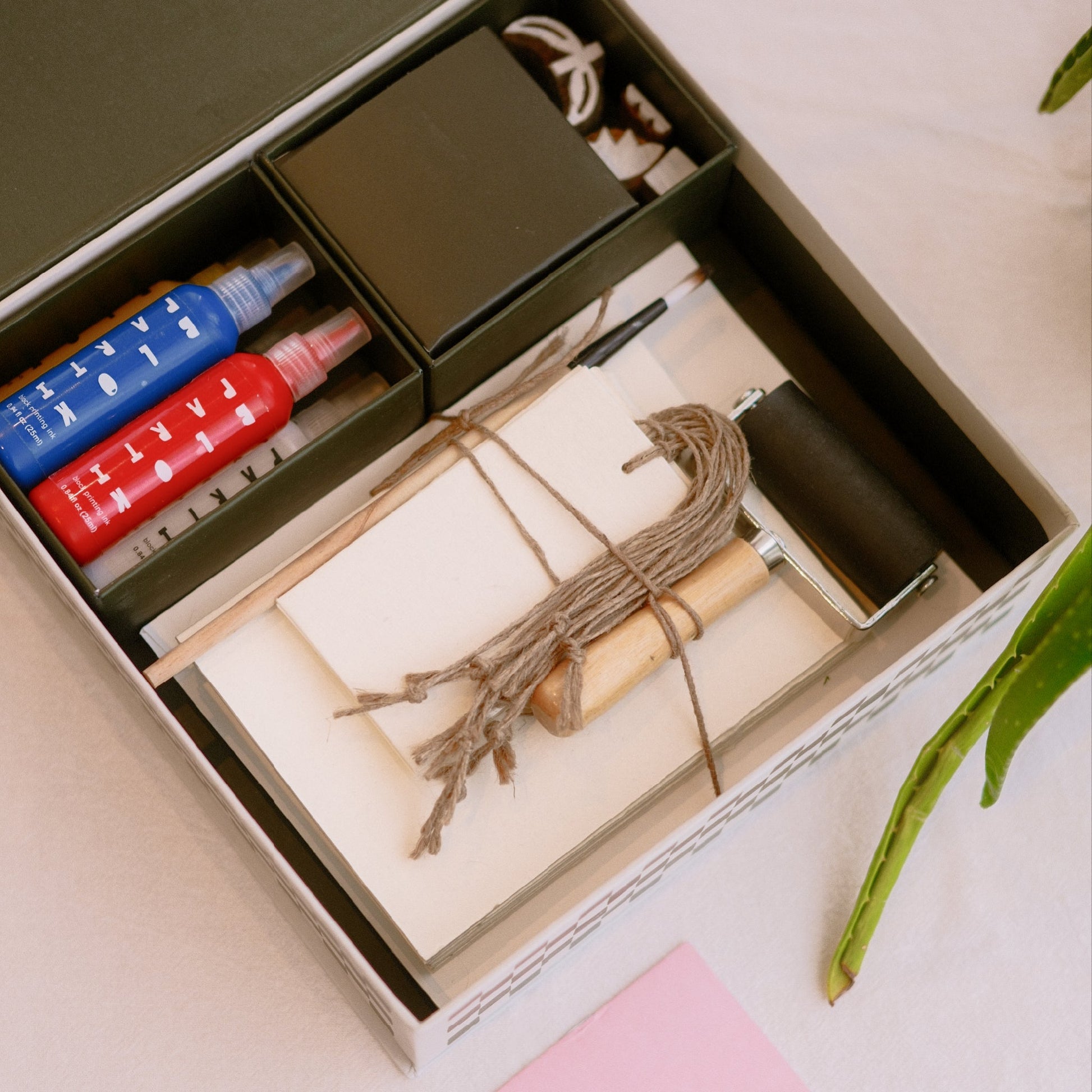 Everything you need to create your own custom block printed stationery! Inside this block printing kit, you’ll find all the tools you need to learn the art of block printing, including hand-carved wooden blocks, handmade paper stationery and five non-toxic block printing inks. No experience necessary - simply follow the easy steps in the guide and take a moment to slow down, get creative and enjoy the process. What’s Included: - Four hand carved wooden blocks (Indian Blackberry Wood). - Blocks include; Tulip Flower, Tulip Plant, Square, Half circles border - 10 hand pressed, recycled cotton paper gift cards with envelopes - 10 hand pressed, recycled cotton paper gift tags - Five bottles of non-toxic, acrylic block printing inks in black, white, red, blue, and yellow (0.7 fl oz / 20ml). - One rubber brayer for smooth application. - One paintbrush with natural uncoated wooden handle. - One acrylic ink plate. - One block printing guide filled with tips and ideas.
