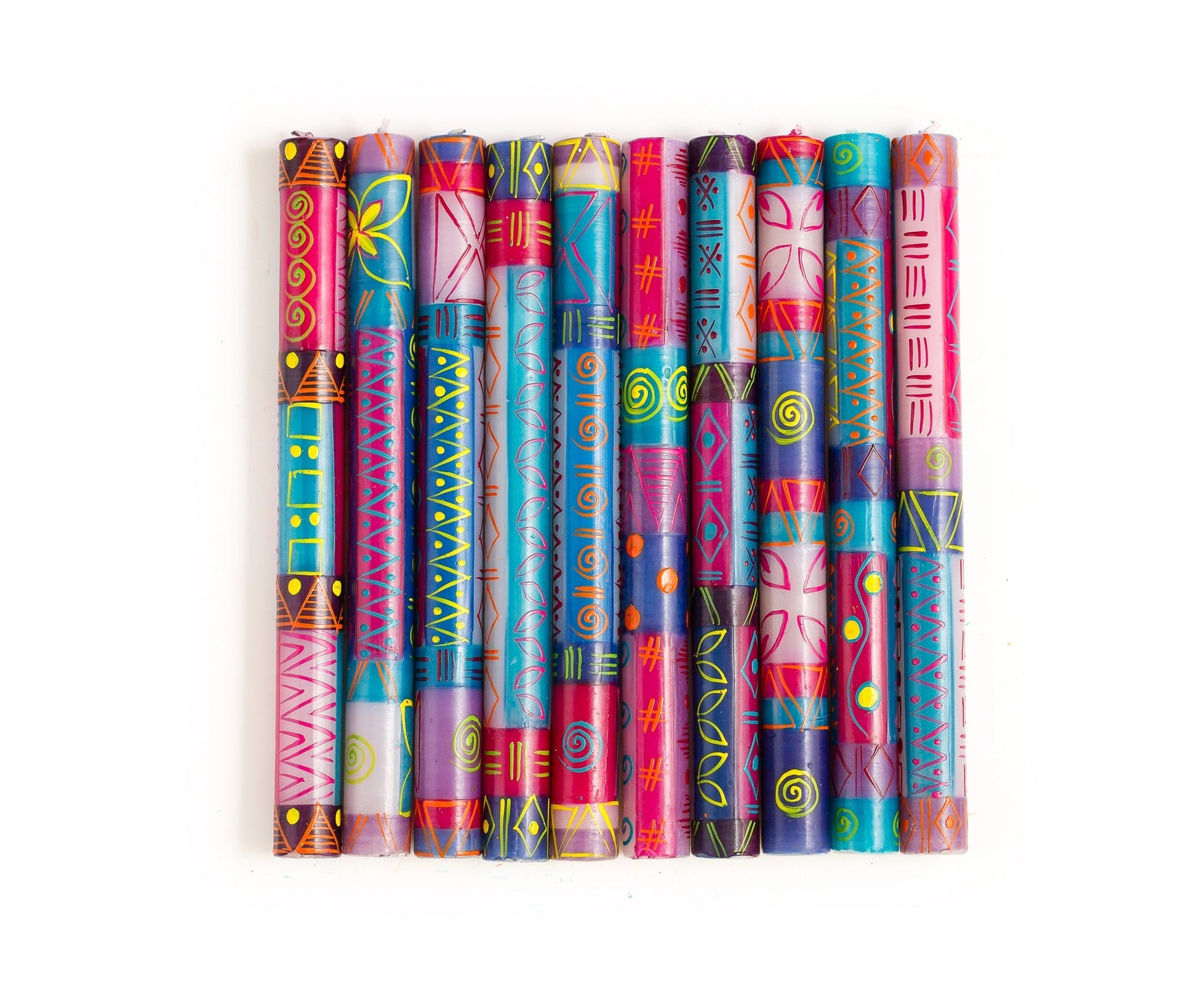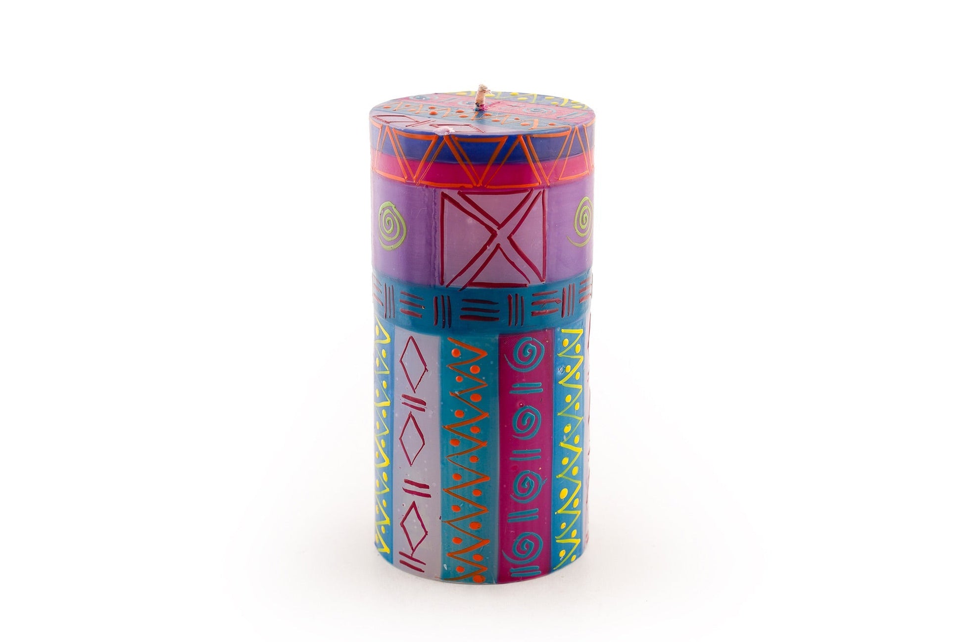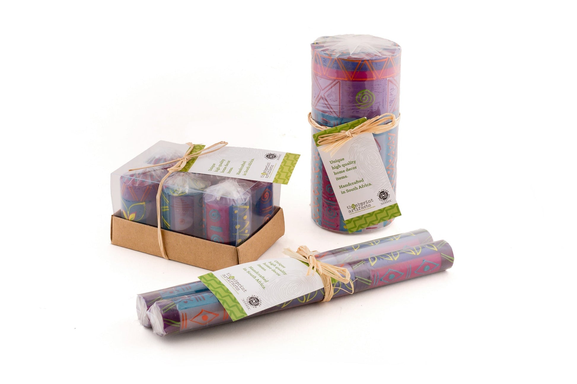Blues, purple, fuchsia, and yellow.. now that's a Blue Moon! *Lovingly hand poured and hand painted in South Africa. *Crafted primarily by single mothers from the local rural community. *On average, each artisan supports an extended family of 12-15 people. PRODUCT DESCRIPTION: *Highest quality natural paraffin wax with 100% cotton wick *Unscented, smokeless, and free from added toxins *Tapers packaged as a matched pair *Each candle is uniquely made. Your delivered candle will likely appear slightly different from the website photo, but consistent with the theme of the collection. CANDLE CARE: *First burn time: 1-hour for every inch diameter *Wicks should always be cut to ¼” prior to lighting *Avoid drafts – they cause dripping! *Ensure candles are extinguished prior to leaving the room Learn more about the artisan hands that make this Fair Trade product!