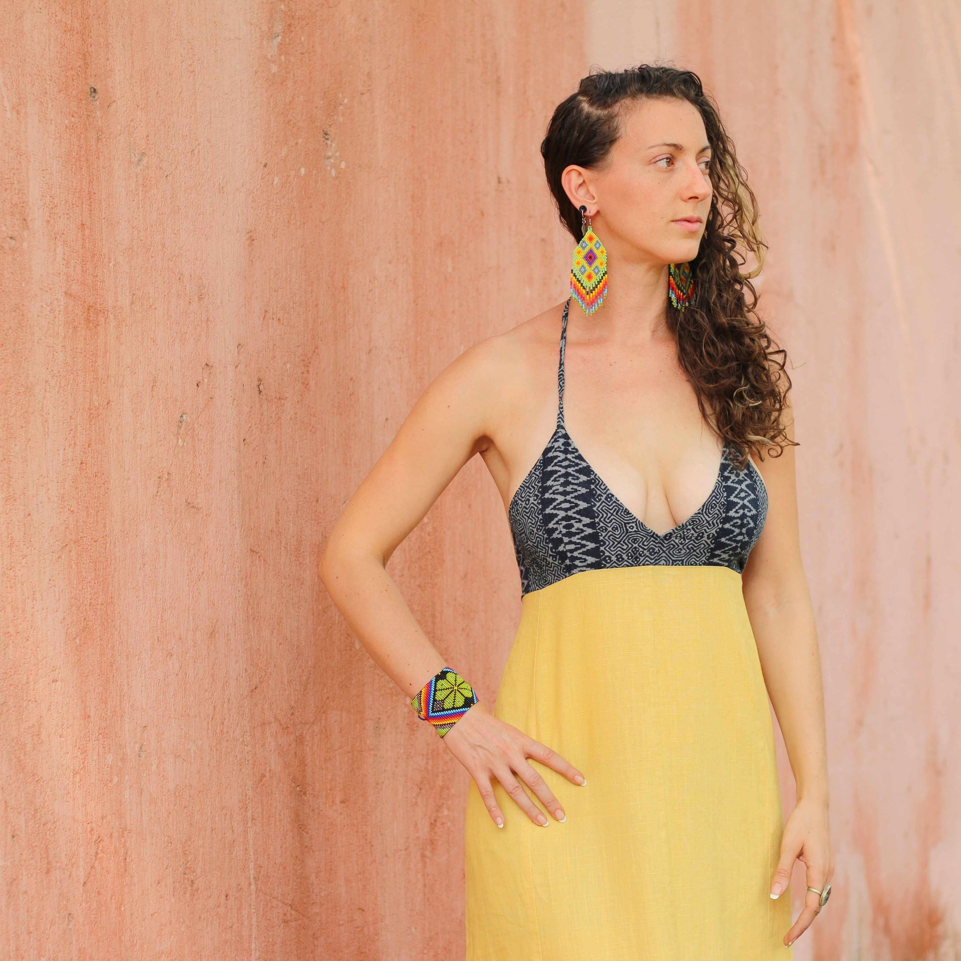 Take a look at our exquisite Flor earrings - a masterpiece of handcrafted artistry. Artisan Maria from the highlands of Guatemala has carefully handcrafted each earring with meticulous attention to detail. The intricate design is created by weaving together tiny, colorful glass seed beads, resulting in a stunning burst of color and style.