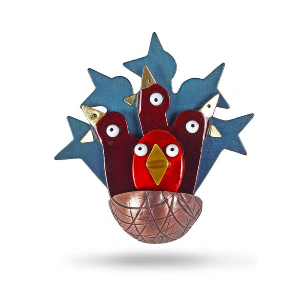 A very layered and sculptural brooch fabricated in brass and copper.It is then oxidized and enamel painted in either red or blue. The birds are cleverly tucked into a copper nest. Front bird group trembles on a spring. Fabricated and sprung.2.25 x 2"
