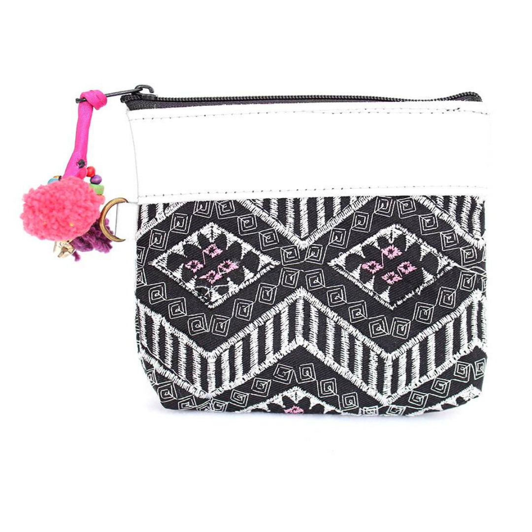 Beautiful embroidery is paired with soft leather and finished with a fun pompom zipper pull. A small brass d-ring can be used to attach to keys or purse!
