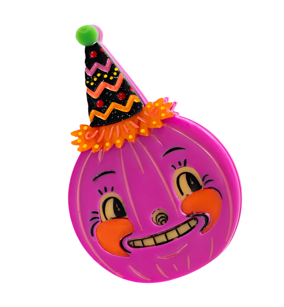 Add a burst of playful color to your Halloween wardrobe with the Jackie Plum Brooch, designed by Johanna Parker and brought to life by Lipstick & Chrome. This quirky magenta pumpkin wears a festive party hat trimmed with bright orange ruffles, capturing Johanna’s signature mix of whimsy, nostalgia, and Halloween magic.