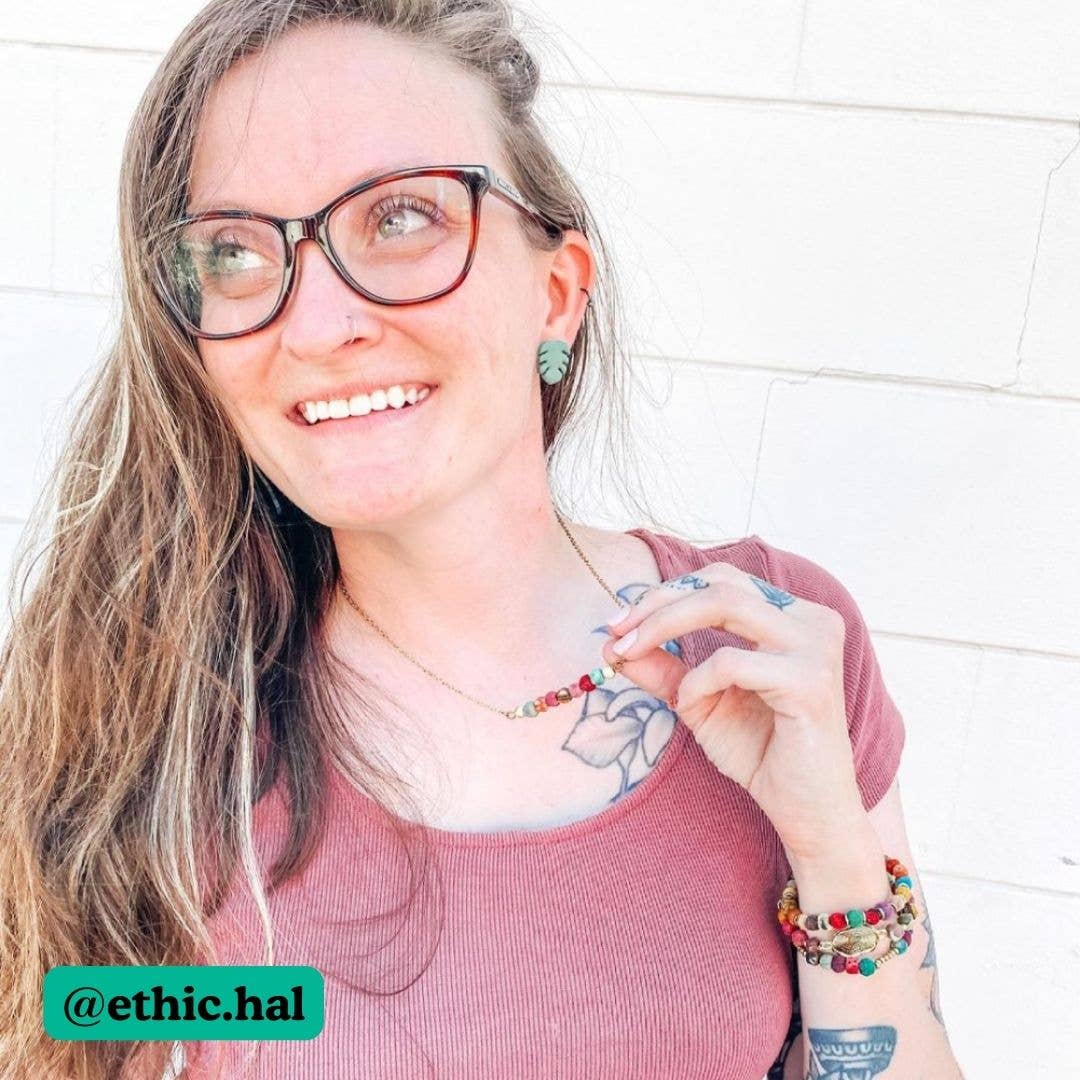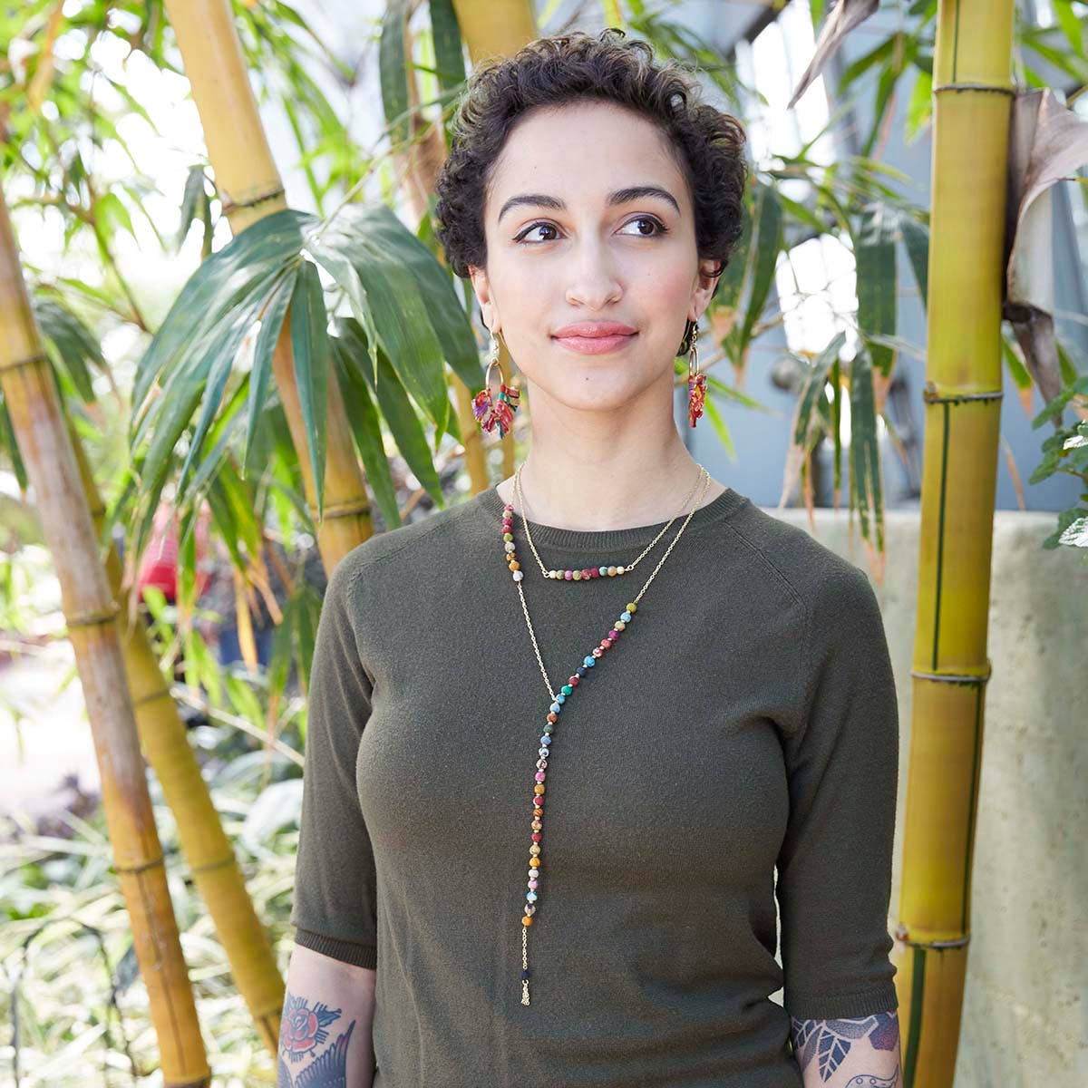 Seven colorful Kantha beads form a horizontal line, and are bookended by sparkly gold glimmer beads to create a delicate silhouette. Great to wear alone or layered. Each piece is made from recycled Kantha textiles, so colors and patterns are all one-of-a-kind and will vary. Measures 18" with a 3" extender. Sustainably handmade by women artisans in India.