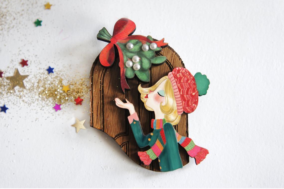 This charming mid-century brooch captures the magic of holiday romance! Handcrafted from natural wood with laser-cut precision, it features a delightful Laliblue illustration in authentic 1950s style. Layered construction and a satin finish create subtle depth and a lustrous glow. Weighing almost nothing, it's the perfect festive accessory—secure it with the included safety pin and lock. A whimsical gift for collectors and vintage lovers alike.