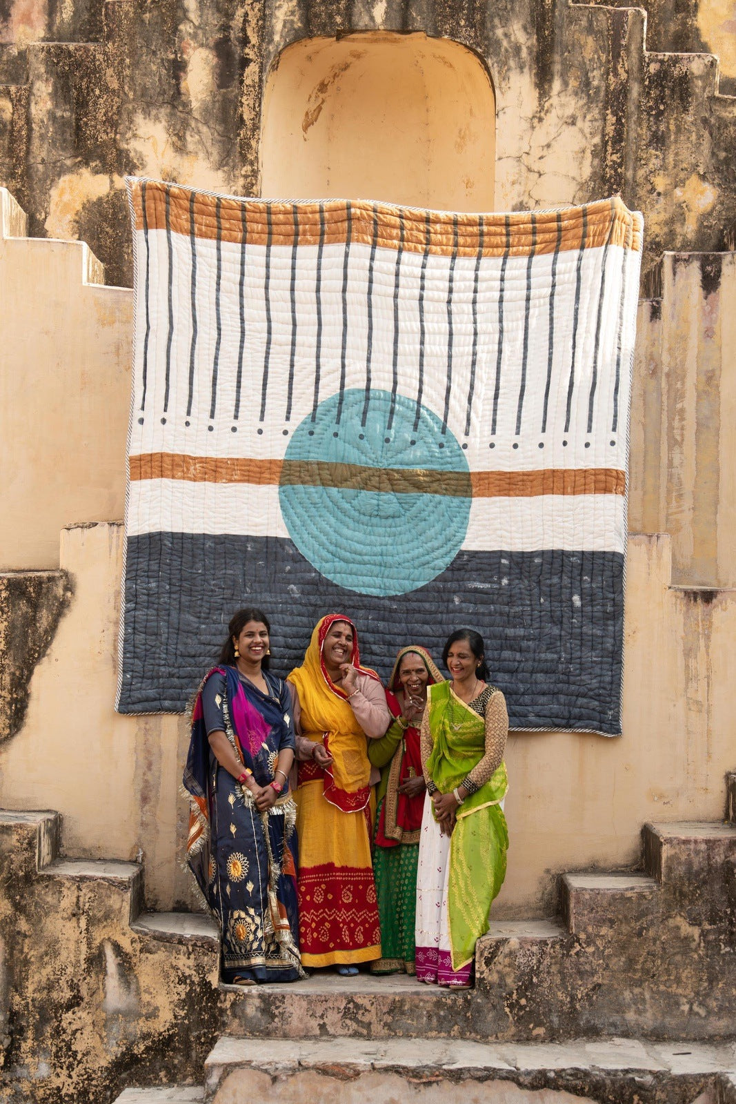 The design is hand-pressed onto each quilt using hand-carved wooden blocks dipped in dyes. The printed cotton shells are brought to the homes of quiltmakers, who stuff and stitch the quilts by hand, creating the final product.