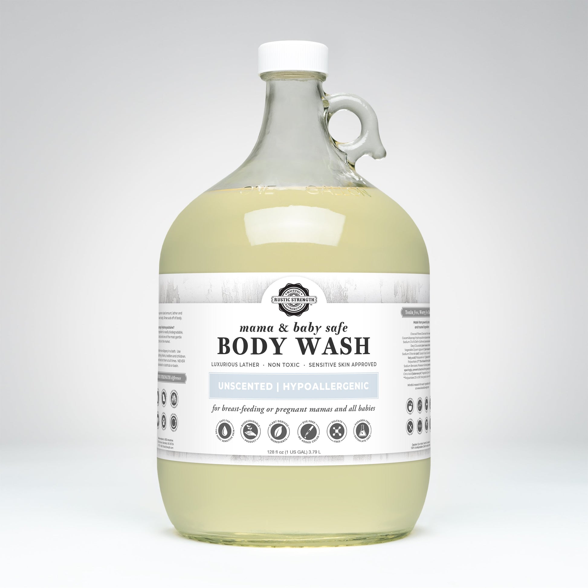 Mama + Baby Safe | Rustic Strength Body Wash is made with high-purity and concentrated active plant-based ingredients and is less likely to irritate even the most sensitive skin. It is safe for pregnant or breastfeeding mamas as well as babies when no scents are added. That's why we called this line "Mama + Baby Safe"