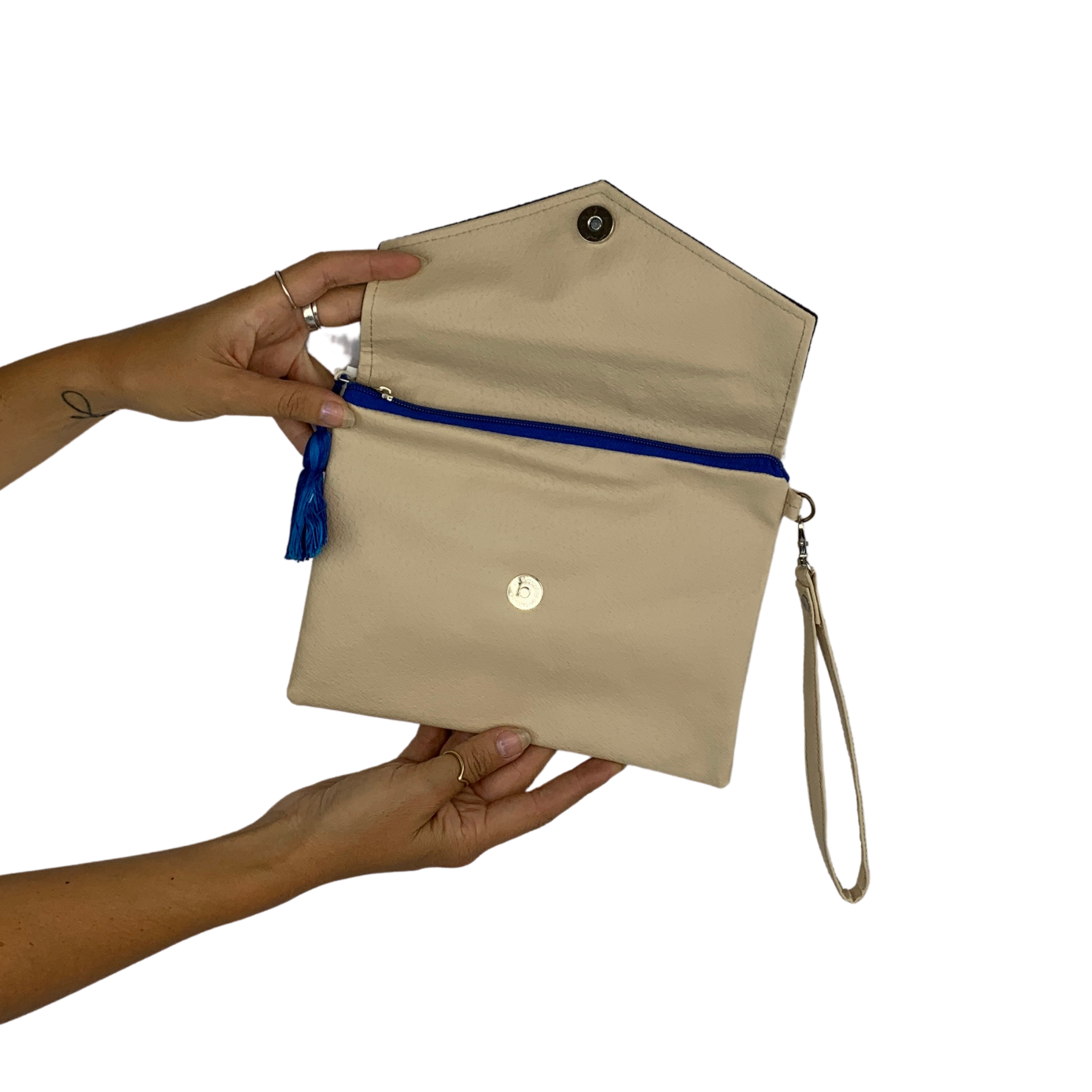 Inside, discover a thoughtful design with a zippered pocket for secure storage. Carry it effortlessly with the attached wrist strap, while a playful tassel adds a touch of flair. Elevate your fashion with this handcrafted wristlet that beautifully blends tradition and modernity.